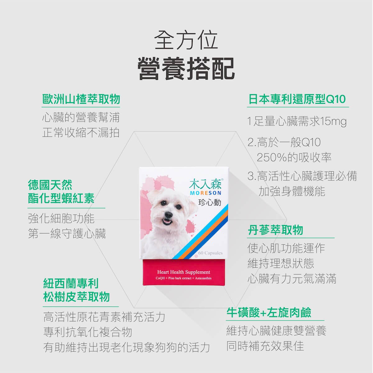 堅持犬貓保健食品分類的木入森,提出改善狗狗心臟問題的「犬寶珍心動」,選用日本專利還原型Q10,給予心臟足量的需求劑量15mg,且高於一般Q10達250%的吸收率,能改善心衰竭症狀、減緩衰老速度,還有紐西蘭專利松樹皮萃取物,富含高活性原花青素,可補充活力,有助維持出現老化現象狗狗的活力,搭配德國天然酯化型蝦紅素,可維持良好心肌的動能。