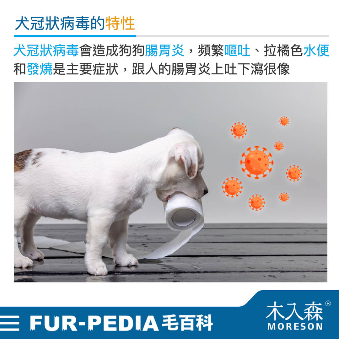 犬冠狀病毒最大特性就是會造成狗狗的腸胃炎,頻繁地嘔吐、拉橘黃色水水糊糊糞便和發燒是主要症狀,跟人的病毒性腸胃炎上吐下瀉很像,雖然致死率低,但會讓狗狗虛弱又痛苦,有得過腸胃炎的人應該都能想像~