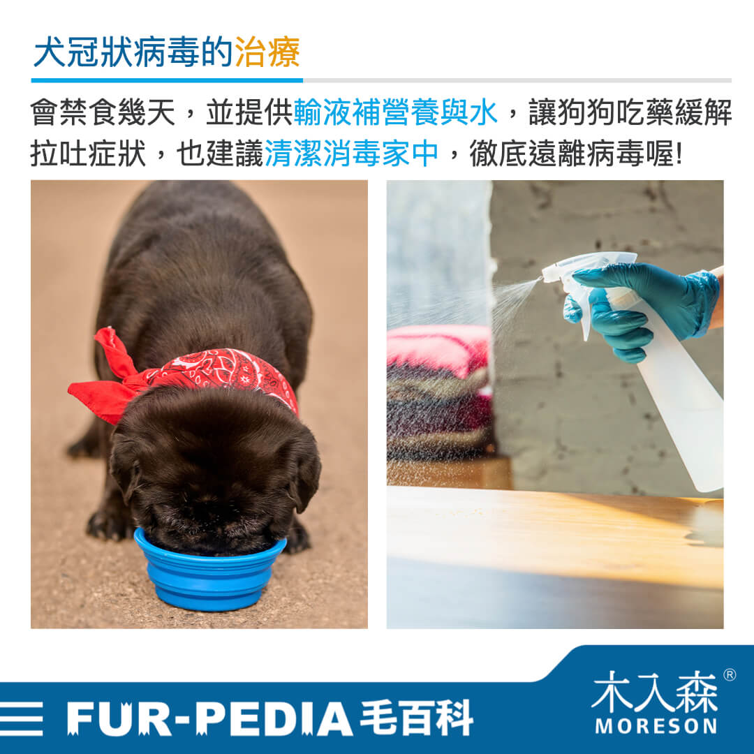基本步驟與人得腸胃炎很像,會要禁食禁飲水幾天,醫師會給輸液提供營養需求並防止狗狗脫水,提供幫助止瀉止拉藥物,並給予抗生素防止繼發感染,也建議多幫狗狗消毒家裡與清潔狗狗生活用品,病毒是怕漂白水與陽光的,可以預防狗狗未來又再度感染的可能性,也減少傳播給其他一起生活的狗狗。