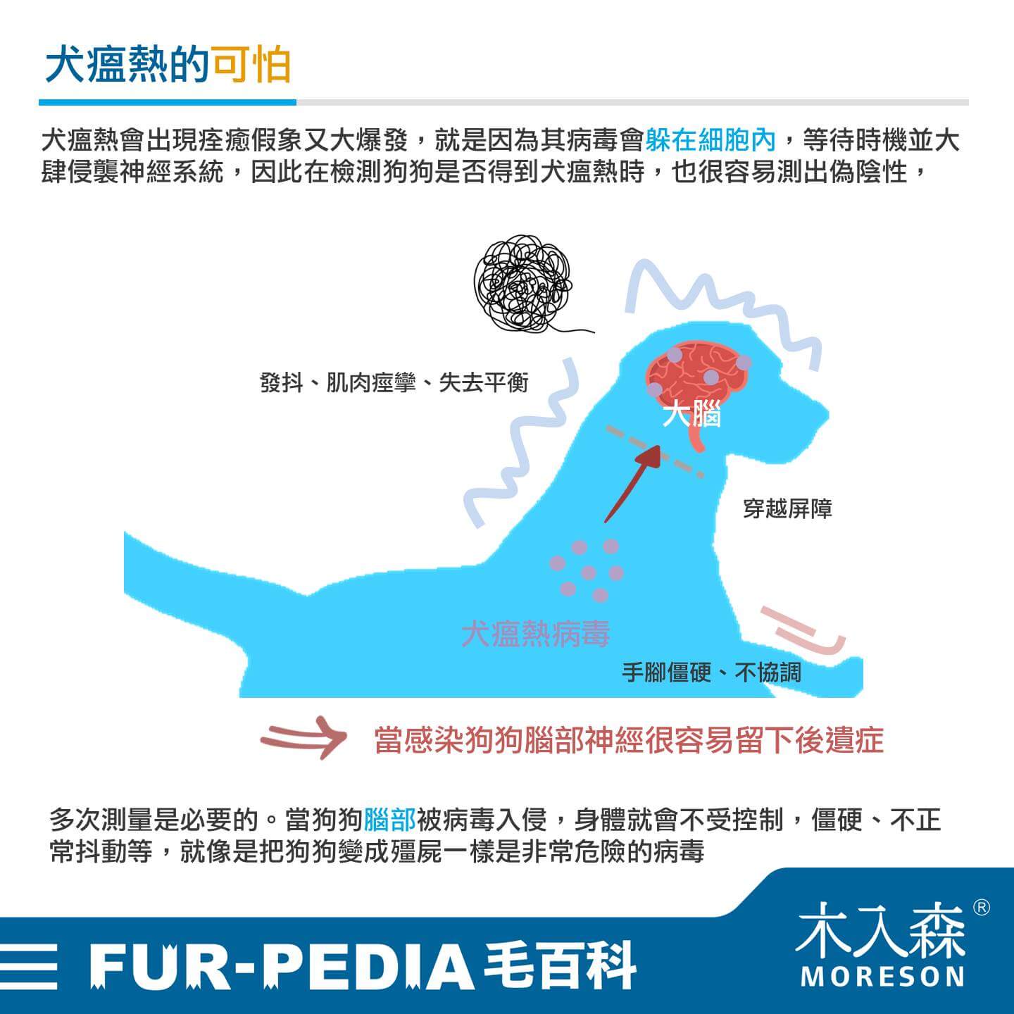 犬瘟熱會出現痊癒假象又大爆發,就是因為其病毒會躲在細胞內,等待時機並大肆侵襲神經系統,因此在檢測狗狗是否得到犬瘟熱時,也很容易測出偽陰性,多次測量是必要的。當狗狗腦部被病毒入侵,身體就會不受控制,僵硬、不正常抖動等,就像是把狗狗變成殭屍一樣是非常危險的病毒。