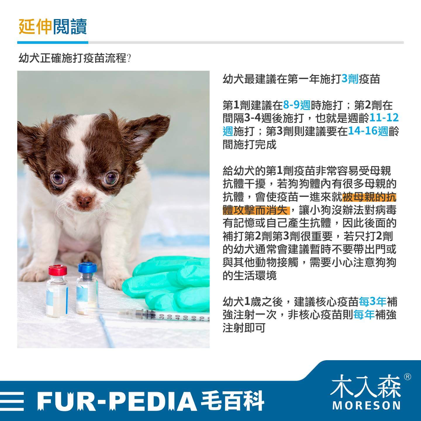幼犬1歲之後,建議核心疫苗每3年補強注射一次,非核心疫苗則每年補強注射即可。