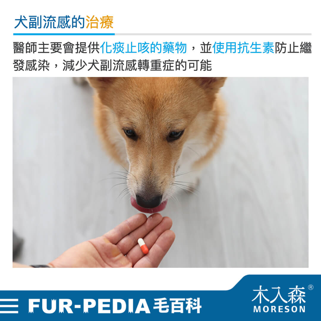 由於犬副流感與造成犬舍咳等多種呼吸性病毒感染相似,因此若單單根據臨床症狀很難確診,還是建議當發現狗狗咳嗽、打噴嚏與發燒時,盡快送醫由醫院分離篩檢病毒最為精準。確定是犬副流感後,醫師主要會提供化痰止咳的藥物,而因為犬副流感而感染其他病菌,是造成重症的主因,因此通常會使用抗生素防止繼發感染,最後視狗狗嚴重程度,醫師也會給予高免血清進行緊急預防接種。