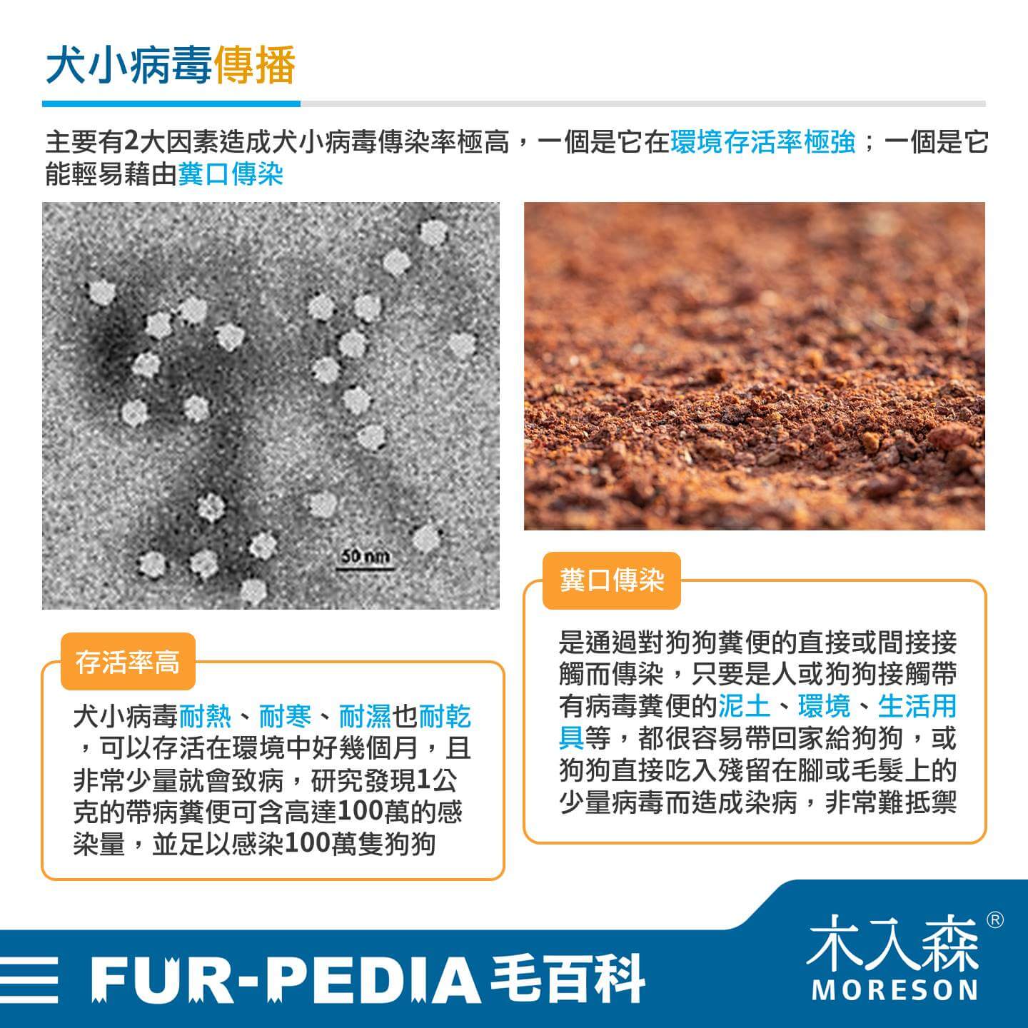 糞口傳染是通過對狗狗糞便的直接或間接接觸而傳染,只要是人或狗狗接觸帶有病毒糞便的泥土、環境、生活用具等,都很容易帶回家給狗狗,或狗狗直接吃入殘留在腳或毛髮上的少量病毒而造成染病,非常難抵禦。
