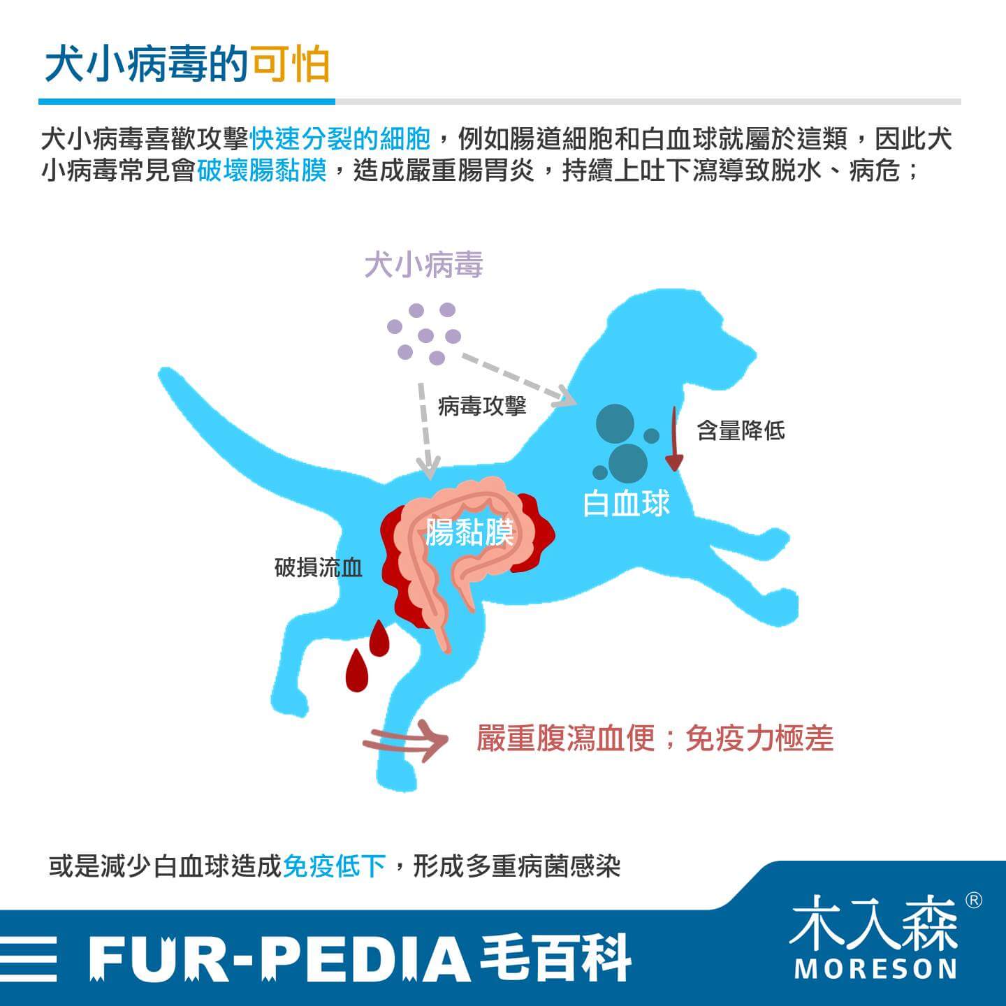 犬小病毒喜歡攻擊快速分裂的細胞,例如腸道細胞和白血球就屬於這類,因此犬小病毒常見會破壞腸黏膜,造成嚴重腸胃炎,持續上吐下瀉導致脫水、病危;或是減少白血球造成免疫低下,形成多重病菌感染。