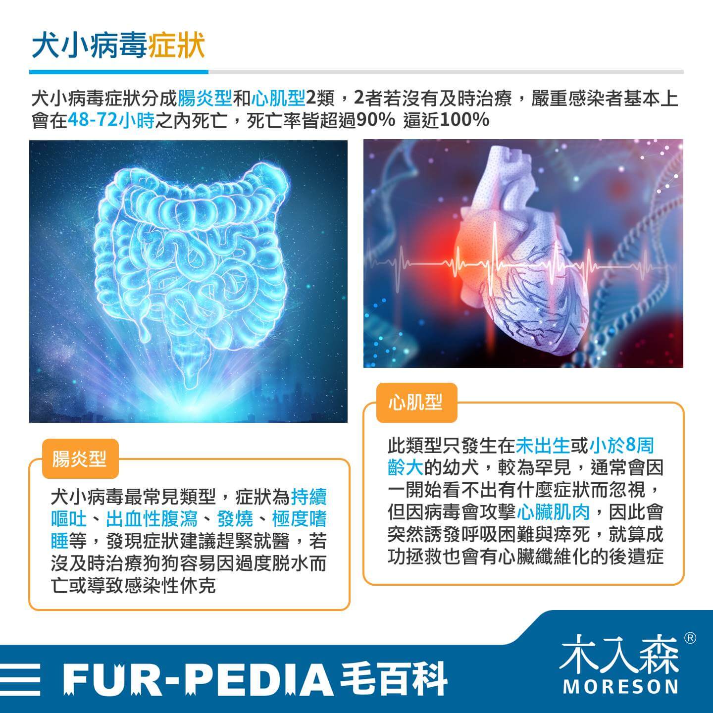 犬小病毒症狀分成腸炎型和心肌型2類,2者若沒有及時治療,嚴重感染者基本上會在48-72小時之內死亡,死亡率皆超過90% 逼近100%。