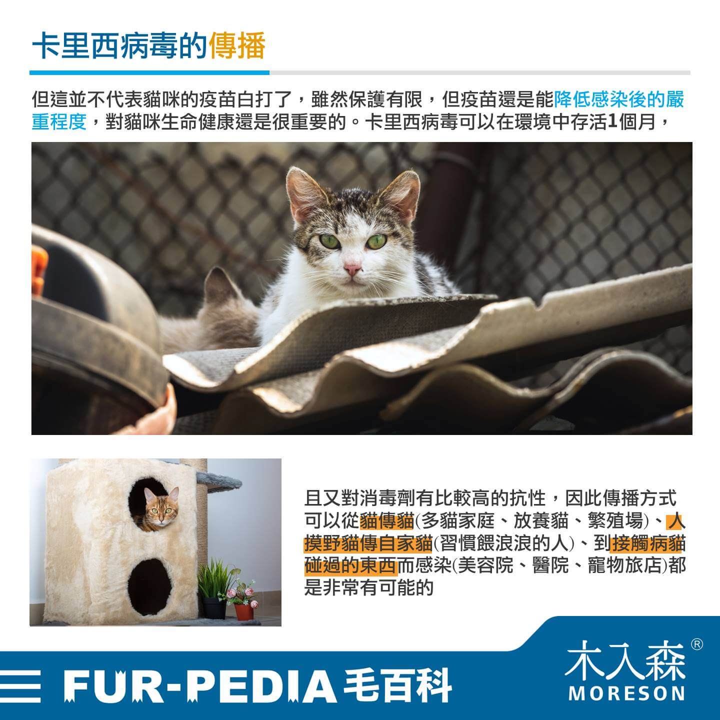 但這並不代表貓咪的疫苗白打了,雖然保護有限,但疫苗還是能降低感染後的嚴重程度,對貓咪生命健康還是很重要的。卡里西病毒可以在環境中存活1個月,且又對消毒劑有比較高的抗性,因此傳播方式可以從貓傳貓(多貓家庭、放養貓、繁殖場)、人摸野貓傳自家貓(習慣餵浪浪的人)、到接觸病貓碰過的東西而感染(美容院、醫院、寵物旅店)都是非常有可能的