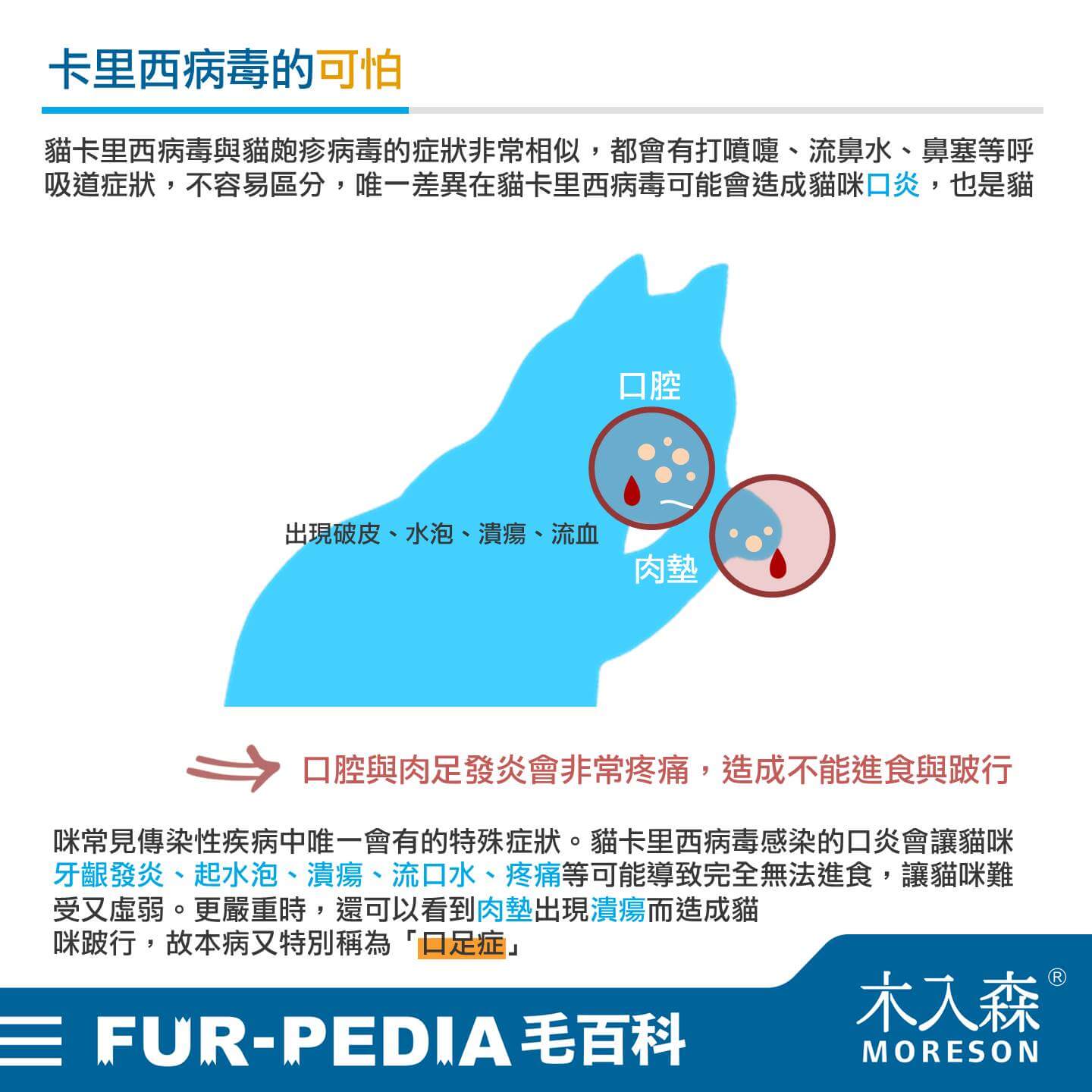 貓卡里西病毒感染的口炎會讓貓咪牙齦發炎、起水泡、潰瘍、流口水、疼痛等可能導致完全無法進食,讓貓咪難受又虛弱。更嚴重時,還可以看到肉墊出現潰瘍而造成貓咪跛行,故本病又特別稱為「口足症」