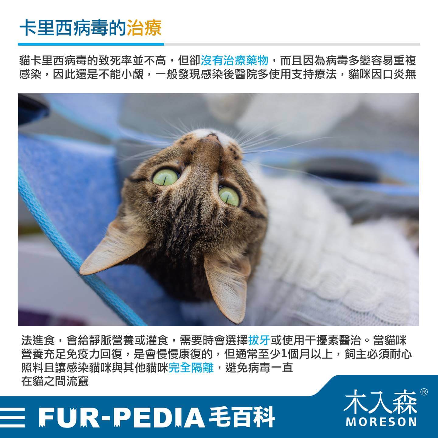 當貓咪營養充足免疫力回復,是會慢慢康復的,但通常至少1個月以上,飼主必須耐心照料且讓感染貓咪與其他貓咪完全隔離,避免病毒一直在貓之間流竄。