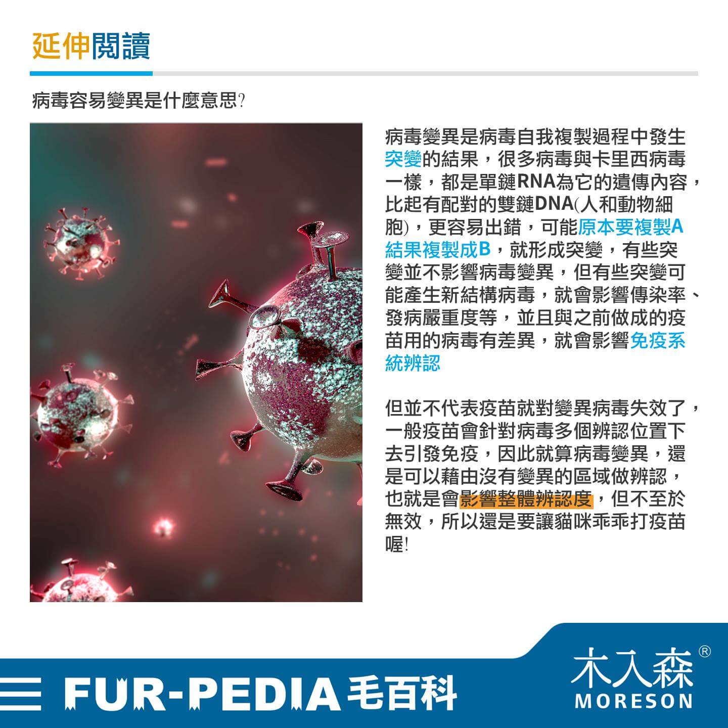 但並不代表疫苗就對變異病毒失效了,一般疫苗會針對病毒多個辨認位置下去引發免疫,因此就算病毒變異,還是可以藉由沒有變異的區域做辨認,也就是會影響整體辨認度,但不至於無效,所以還是要讓貓咪乖乖打疫苗喔!