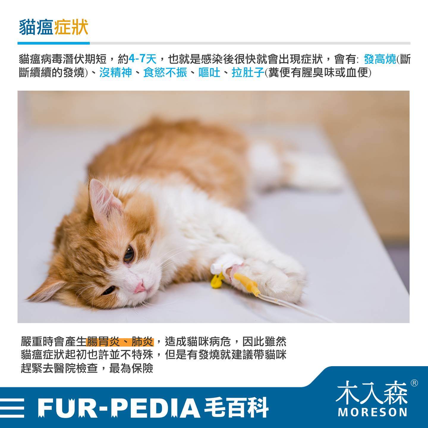貓瘟病毒潛伏期短,約4-7天,也就是感染後很快就會出現症狀,會有: 發高燒(斷斷續續的發燒)、沒精神、食慾不振、嘔吐、拉肚子(糞便有腥臭味或血便),嚴重時會產生腸胃炎、肺炎,造成貓咪病危,因此雖然貓瘟症狀起初也許並不特殊,但是有發燒就建議帶貓咪趕緊去醫院檢查,最為保險。