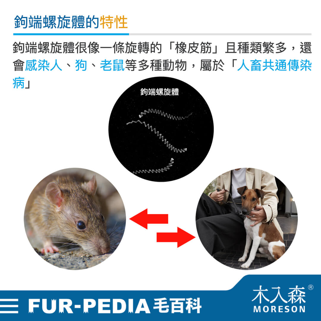 鉤端螺旋體是一種扭轉的長形細菌,很像一條捲在一起的「橡皮筋」,其非常多樣化,目前已發現270幾種,其中有4種(澳洲型、犬型、出血性黃疸型、台灣特有型)是台灣最常見感染狗狗的鉤端螺旋體,且也會感染人、老鼠、貓等多種哺乳類動物,屬於「人畜共通傳染病」。