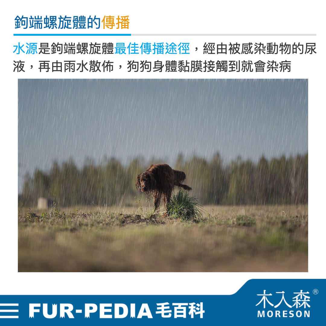 鉤端螺旋體對狗狗來說如同「雨夜殺手」、「水怪」,那是因為水源是它的最佳傳播途徑。當鉤端螺旋體寄生於老鼠或野狗,他們的尿液會充滿此細菌,再傳播至環境中的土壤、植物與水源,尤其颱風、大雨過後,這些細菌更藉由雨水蔓延至各種水坑與環境中,長達數月之久,一旦我們的狗狗外出遊玩、散步,眼睛、鼻子、嘴巴或傷口碰到了這些水源,就會感染鉤端螺旋體。
