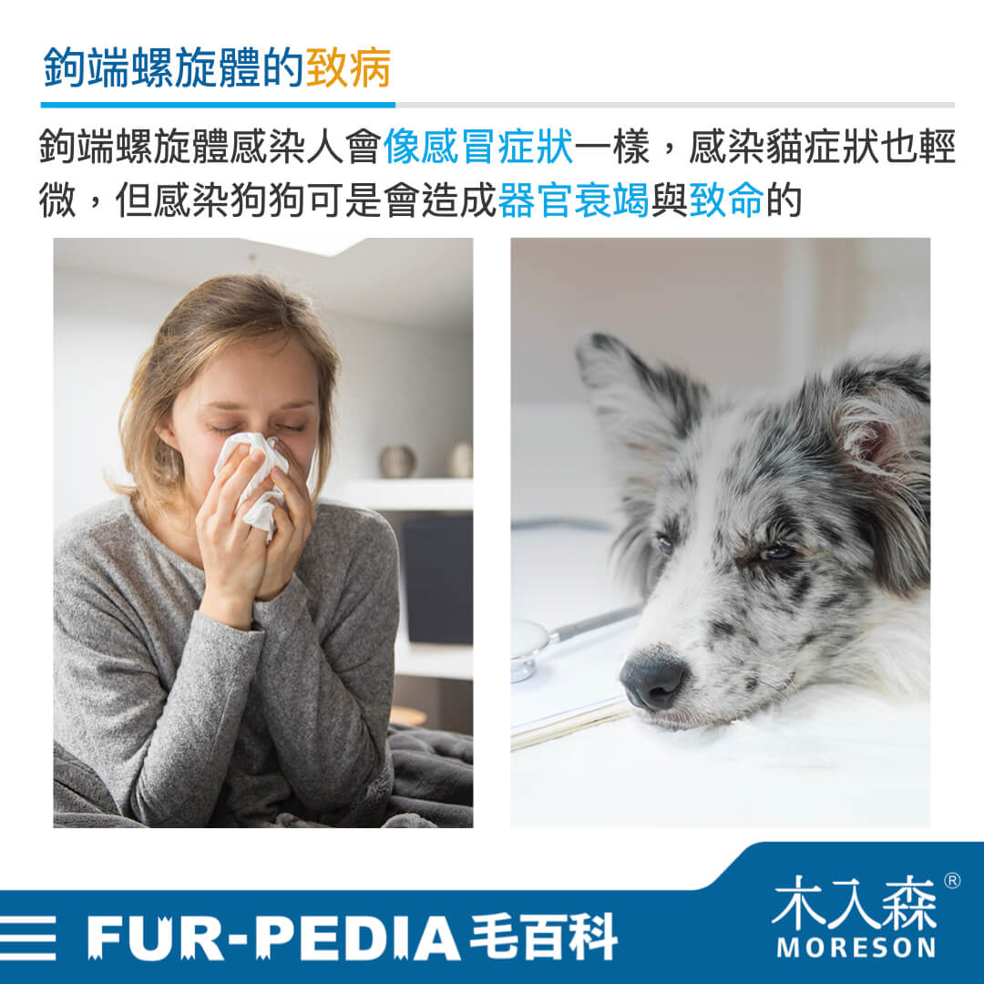 鉤端螺旋體雖然對狗狗危害極大,很容易導致器官衰竭與高達20%的致死率,但對人類或貓咪就不會這麼致命,當我們人感染時會出現發燒、頭痛、腹痛(腹瀉)、肌肉痠痛與倦怠感,很像得到流感一樣;而貓咪症狀會更輕微因此可粗略不記。雖然對我們影響不多,但同個屋簷下的狗狗是會被傳染的,因此受感染者都要嚴格與他人隔離,也最好接觸時戴上手套。