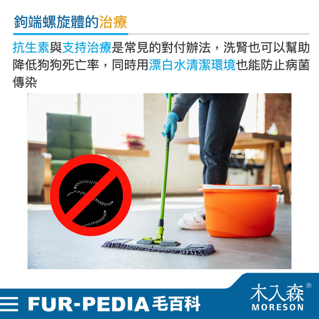 醫生通常都會使用抗生素殺菌(約持續2-4周),必要時給予支持治療對抗多重器官衰竭問題,其中若發生急性腎衰竭,也會選擇幫狗狗洗腎,洗腎可以加強藥物作用並抑制病菌,甚至能有效降低狗狗死亡率。而醫治期間因為人也會感染鉤端螺旋體,因此建議除了隔離狗狗,也應該要用漂白水做好環境消毒,並戴上手套、穿圍裙、長靴避免直接接觸狗狗的尿或受污染的物品。