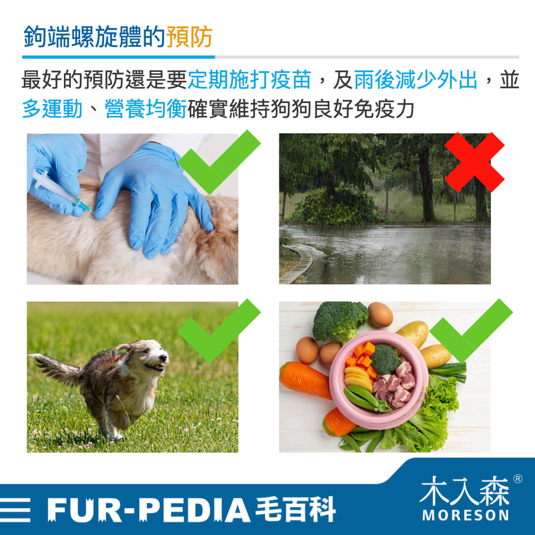 最好的預防還是要定期施打疫苗,並建議颱風、大雨剛過應暫時性減少外出,避免接觸水窪、池塘等不動水源,或未乾的泥土草地植物等,也不要讓狗狗隨意去接觸老鼠等動物屍體,多運動、營養均衡維持良好免疫力,都是避免狗狗被「雨夜殺手」纏上的最好方式喔!