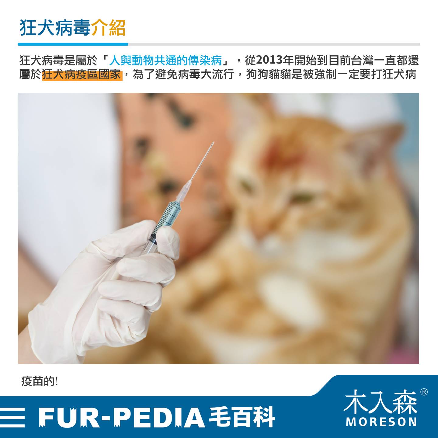 狂犬病毒是屬於「人與動物共通的傳染病」,從2013年開始到目前台灣一直都還屬於狂犬病疫區國家,為了避免病毒大流行,狗狗貓貓是被強制一定要打狂犬病疫苗的