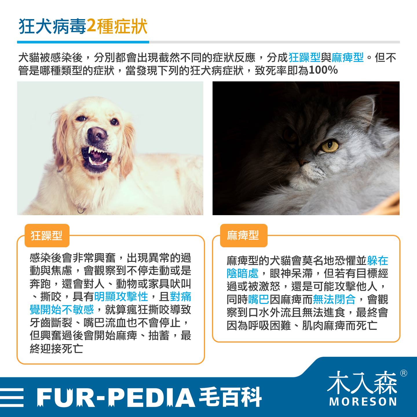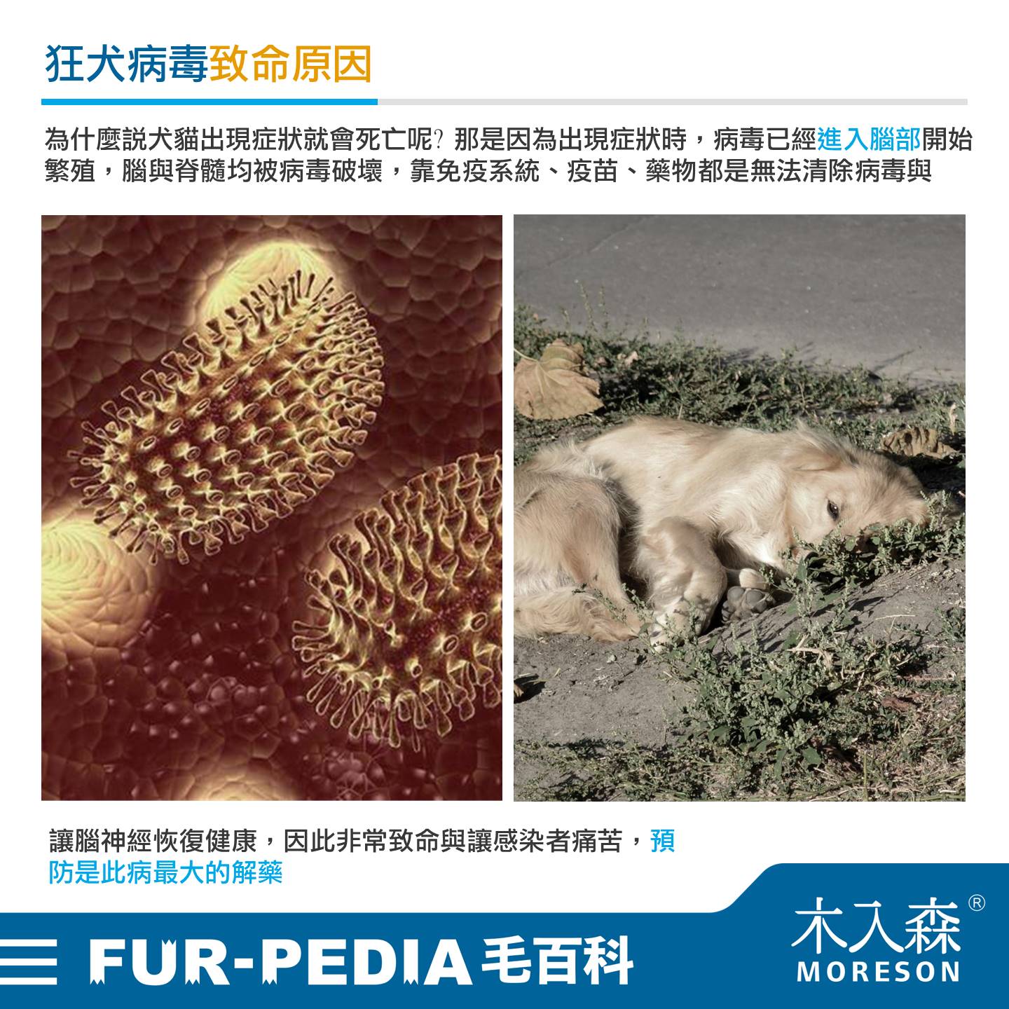 為什麼說犬貓出現症狀就會死亡呢? 那是因為出現症狀時,病毒已經進入腦部開始繁殖,腦與脊髓均被病毒破壞,靠免疫系統、疫苗、藥物都是無法清除病毒與讓腦神經恢復健康,因此非常致命與讓感染者痛苦,預防是此病最大的解藥