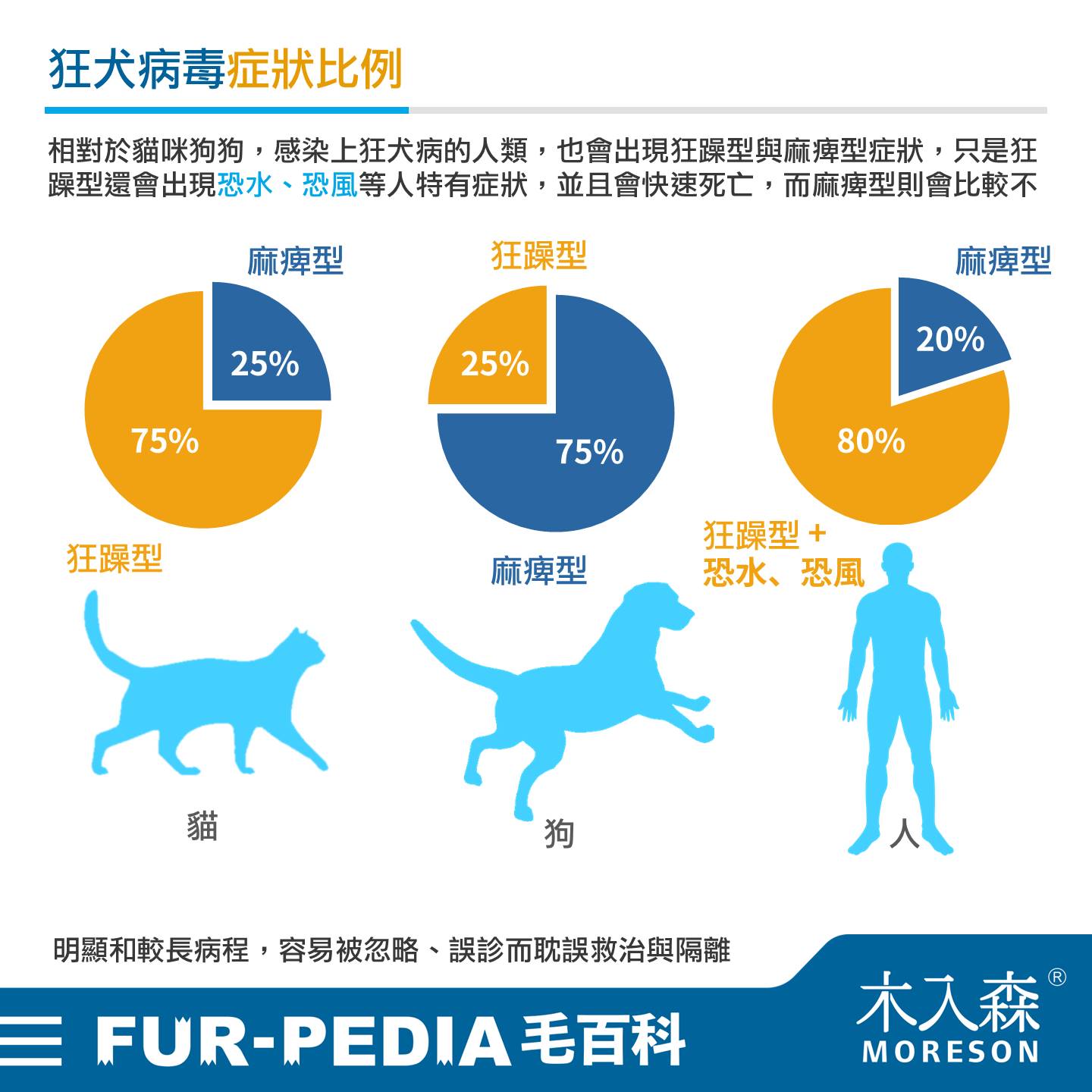相對於貓咪狗狗,感染上狂犬病的人類,也會出現狂躁型與麻痺型症狀,只是狂躁型還會出現恐水、恐風等人特有症狀,並且會快速死亡,而麻痺型則會比較不明顯和較長病程,容易被忽略、誤診而耽誤救治與隔離
