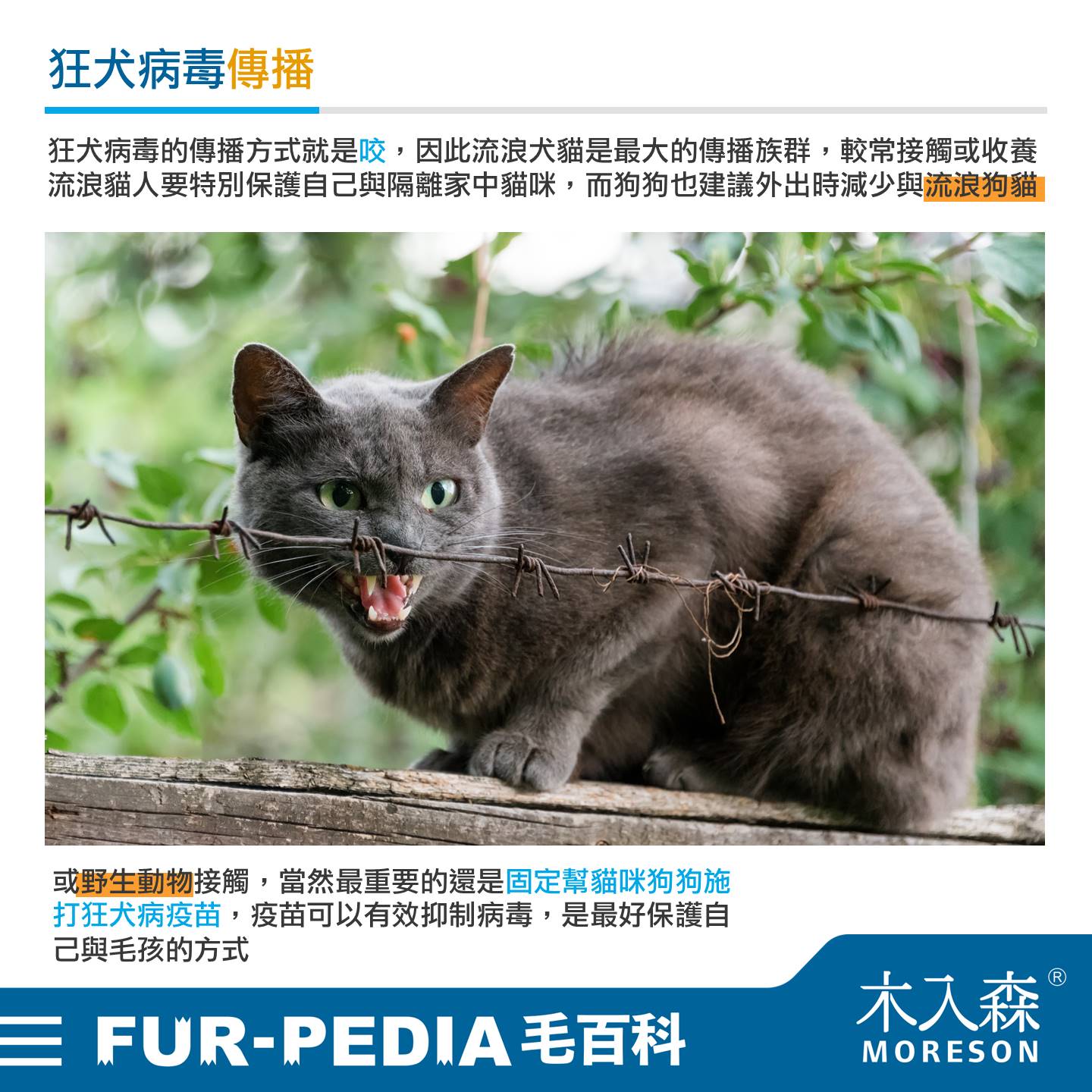 狂犬病毒的傳播方式就是咬,因此流浪犬貓是最大的傳播族群,較常接觸或收養流浪貓人要特別保護自己與隔離家中貓咪,而狗狗也建議外出時減少與流浪狗貓或野生動物接觸,當然最重要的還是固定幫貓咪狗狗施打狂犬病疫苗,疫苗可以有效抑制病毒,是最好保護自己與毛孩的方式