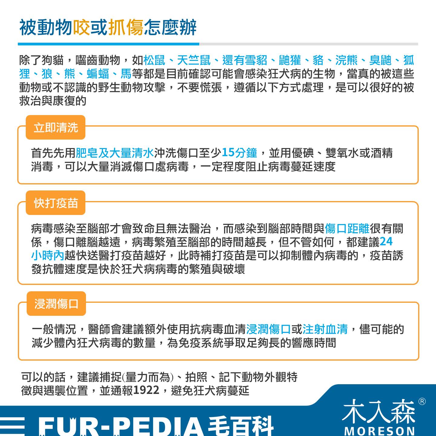 1.立即清洗: 首先先用肥皂及大量清水沖洗傷口至少 15 分鐘,並用優碘、雙氧水或酒精消毒,可以大量消滅傷口處病毒,一定程度阻止病毒蔓延速度