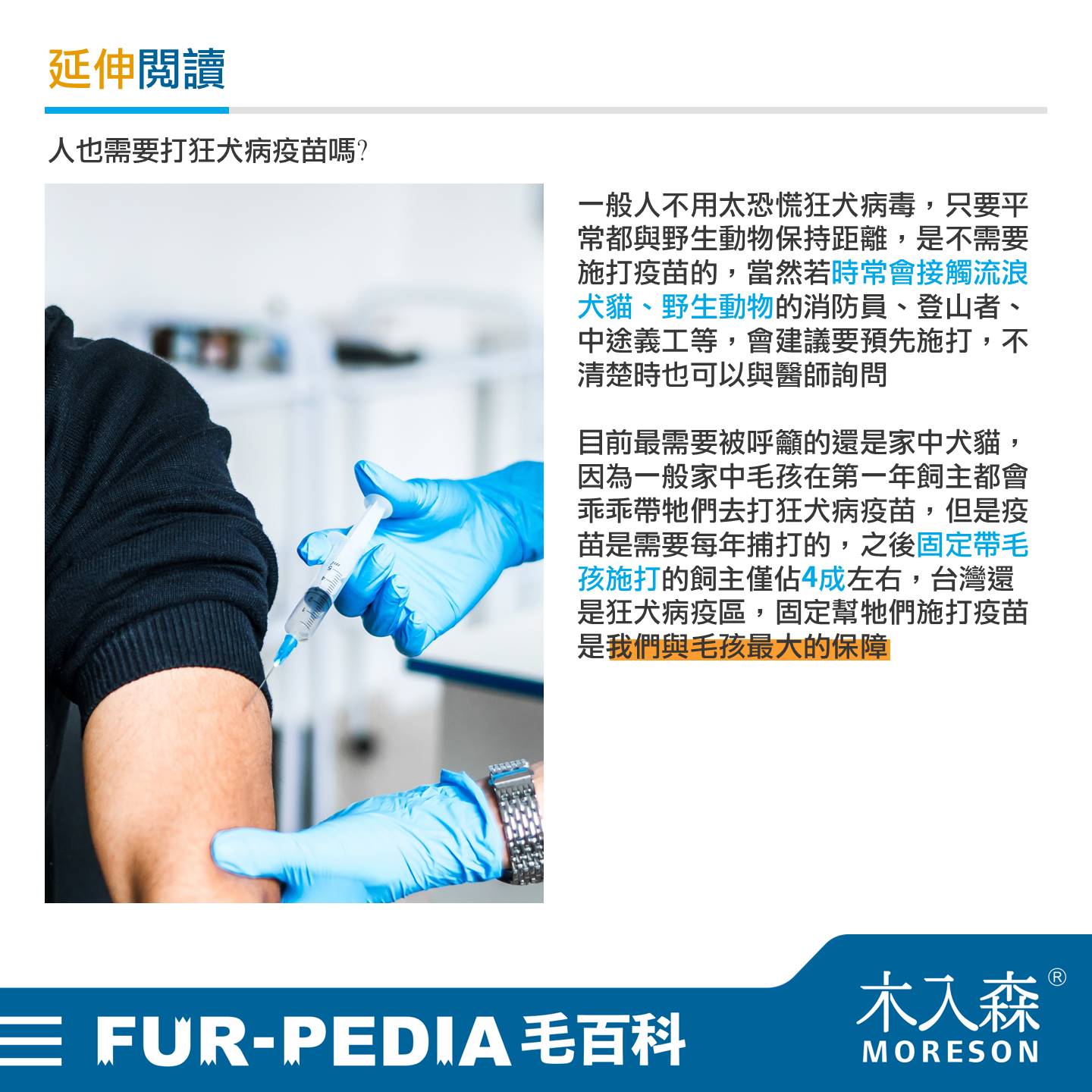 一般人不用太恐慌狂犬病毒,只要平常都與野生動物保持距離,是不需要施打疫苗的,當然若時常會接觸流浪犬貓、野生動物的消防員、登山者、中途義工等,會比較建議要預先施打,不清楚時也可以與醫師詢問。目前最需要被呼籲的還是家中犬貓,因為一般家中毛孩在第一年飼主都會乖乖帶牠們去打狂犬病疫苗,但是疫苗是需要每年捕打的,之後固定帶毛孩施打的飼主僅佔4成左右,台灣還是狂犬病疫區,固定幫牠們施打疫苗是我們與毛孩最大的保障