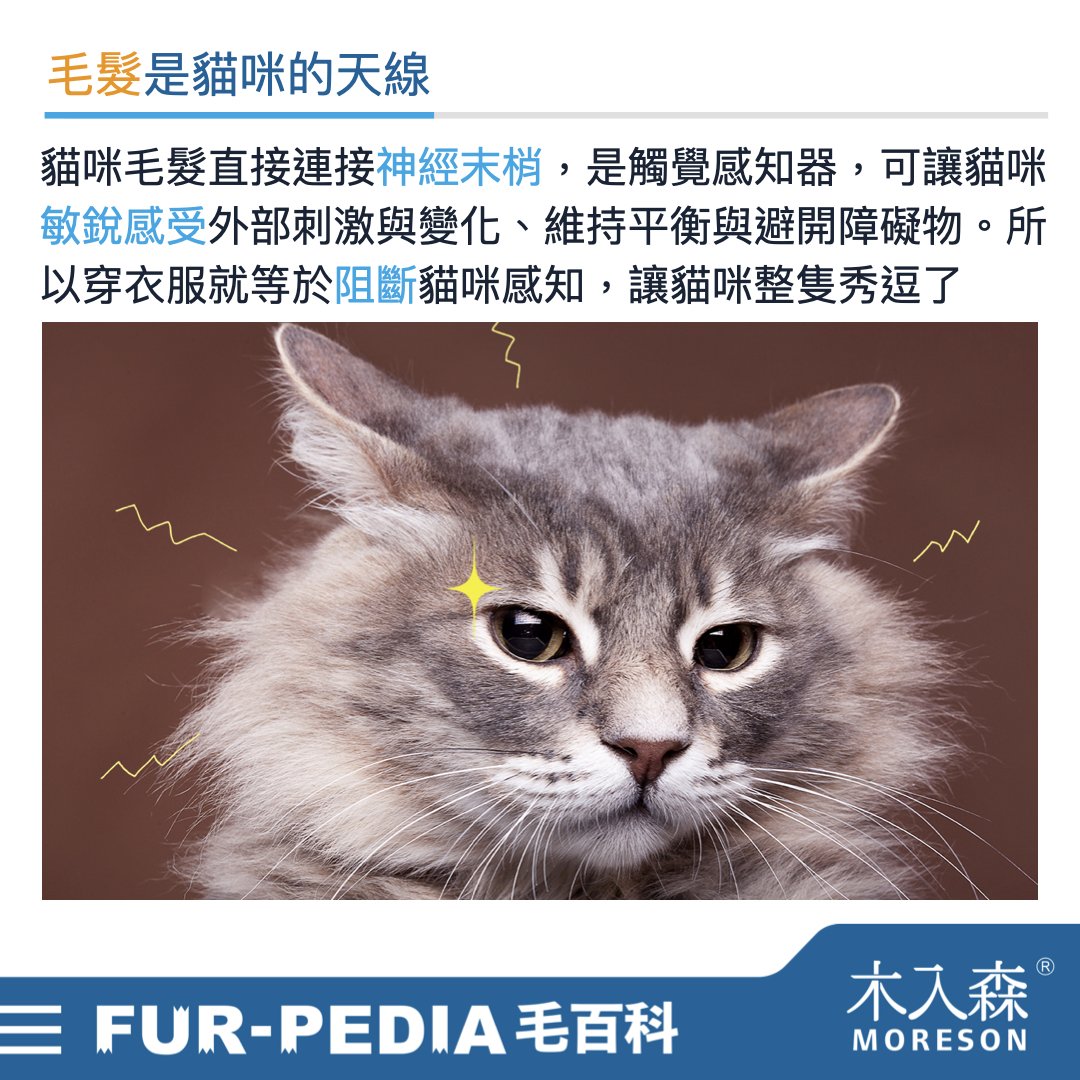 為合貓咪一穿衣服就失控呢? 讓貓咪穿著衣服就走不了路的原因在於貓咪的毛髮被衣服困住了。毛髮是貓咪的天線,很多都直接連接神經末梢,如同貓咪的觸覺感知器,可以敏銳地感受到外部的刺激與變化,讓貓咪維持自身的平衡,避開障礙物。
