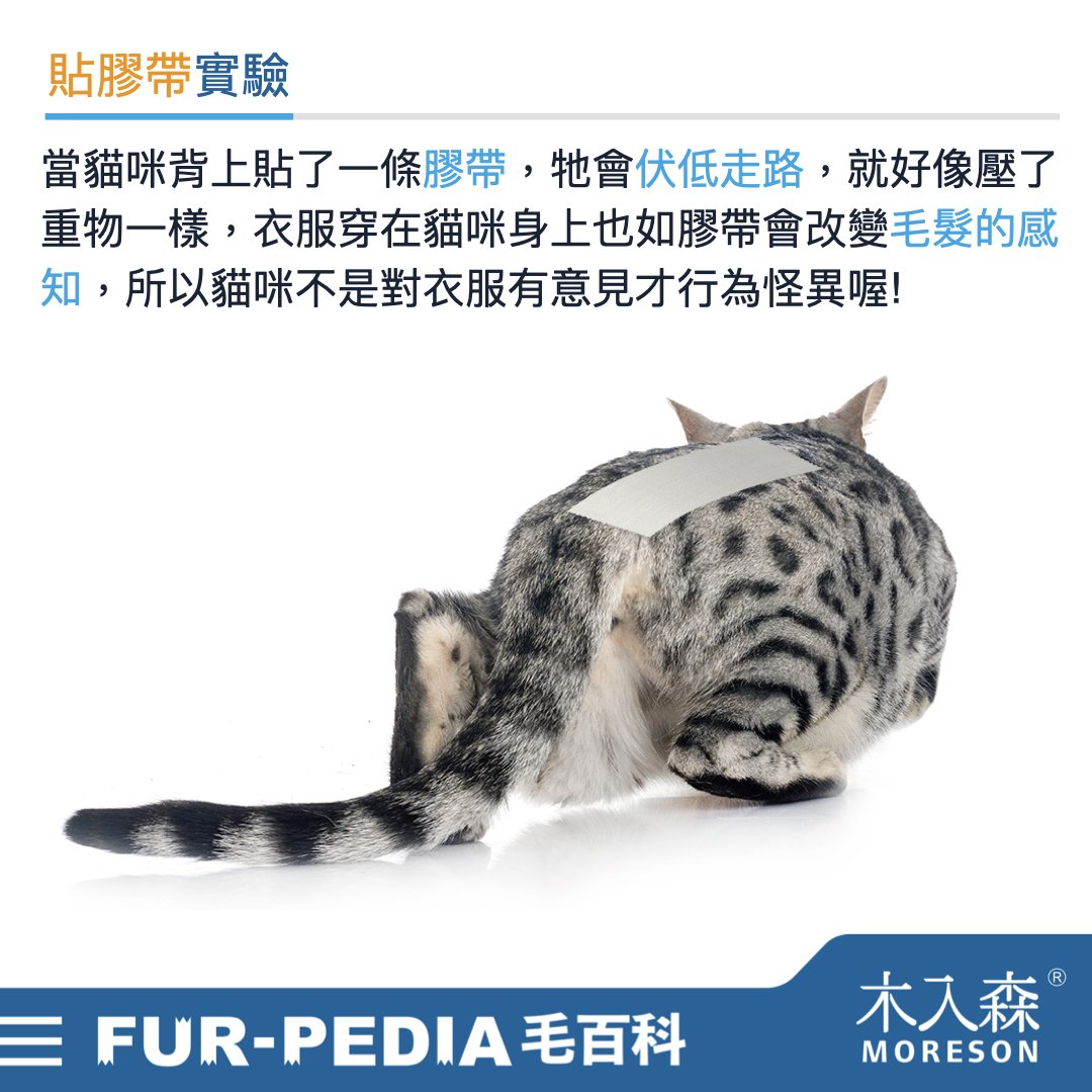 當在貓咪背上貼上一條膠帶,貓咪會伏低身體走路,就好像身上壓了很重的重物一樣;而若膠帶貼在腹側,貓咪可能就會走路歪歪扭扭、東歪西倒,好像失去了平衡感,由此可知,衣服穿在貓咪身上如同膠帶都會改變或阻隔毛髮的感知,而讓貓咪產生失控的搞笑畫面。科學家藉由貼膠帶實驗證實,貓咪不是對衣服不滿或是嫌棄難看而穿著衣服走路奇奇怪怪,是真的因為毛髮感知阻斷而影響靈活度喲! (不推薦飼主在家進行這樣的實驗,貓咪是會感到不舒服及不安的喔!)