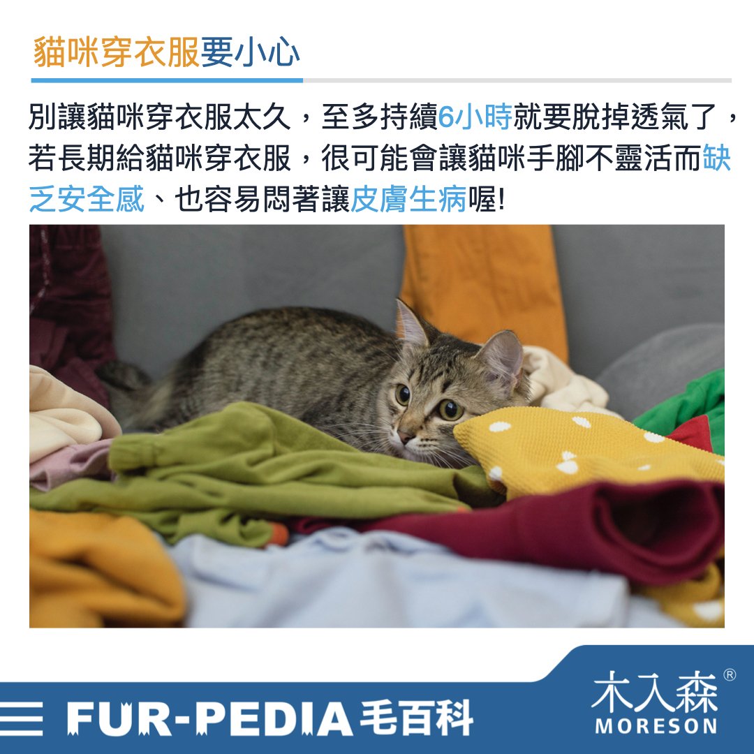 貓咪是可以穿衣服的,但若貓咪是那種一穿上衣服就極度焦慮、恐慌、情緒激動的話,那還真的不要勉強,因為某些貓咪毛髮觸覺是更加敏感易受刺激的。而若貓咪不排斥穿衣服,也建議別讓貓咪穿太久的時間,至多持續6小時就要脫掉讓貓咪透透氣了,若長期給貓咪穿衣服,很有可能會讓貓咪手腳不靈活而缺乏安全感,長期增加貓咪緊張、焦慮的情緒對健康是不好的;長時間的衣服覆蓋也容易讓貓咪毛髮潮濕悶熱,使得皮膚易發炎產生濕疹等皮膚問題;另外,若貓咪長期穿衣服,會慢慢地感知不到溫度,使身體失去適應溫度變化的能力,當一旦主人忘記給牠穿衣服時,貓咪就很容易生病感冒喔! 所以記得幫貓咪穿衣服時要偶爾脫掉休息一下再穿喔!