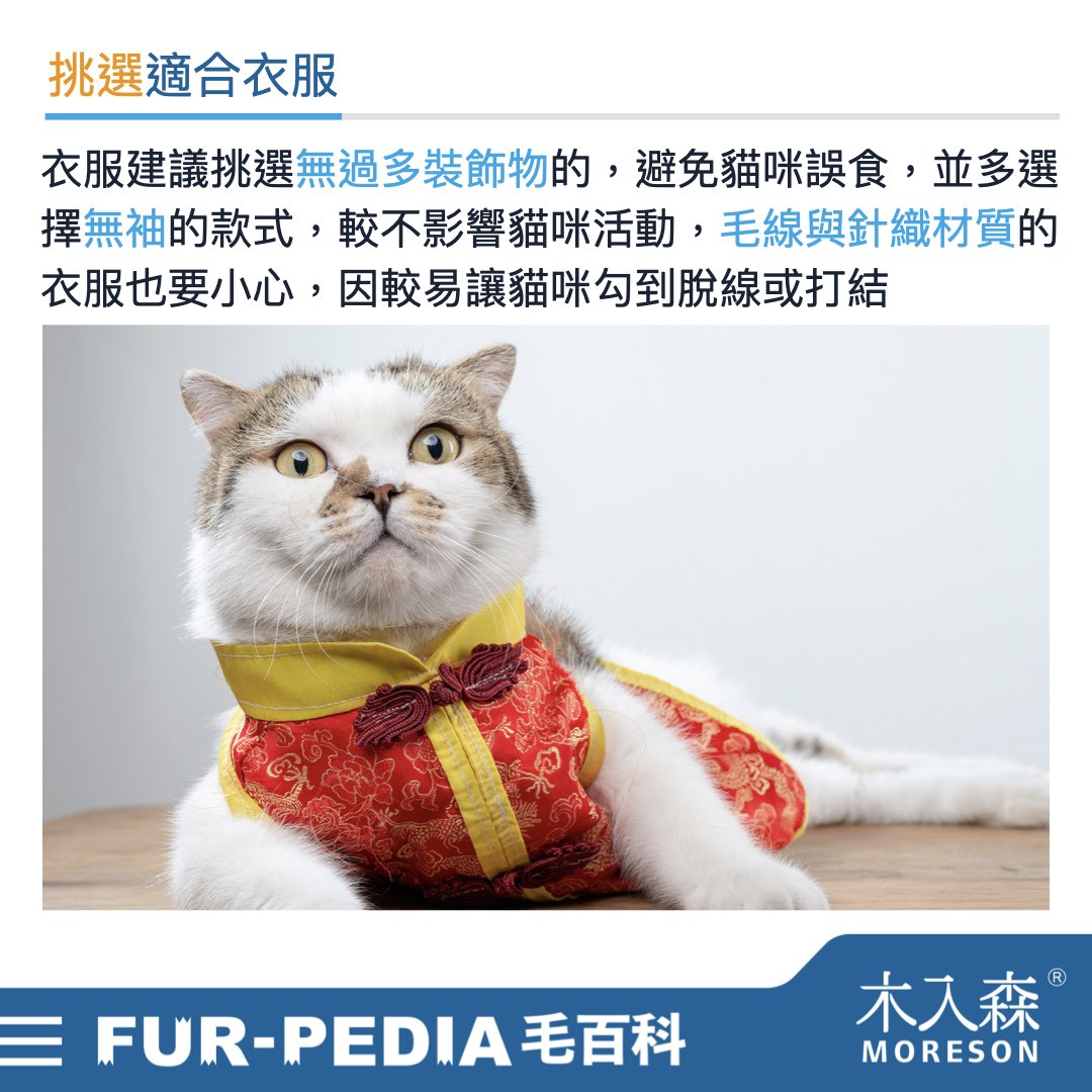 但衣服建議挑選無過多裝飾物的,避免貓咪誤食,並多選擇無袖的款式,才比較不會影響到貓咪活動,毛線與針織材質的衣服也要小心,讓貓咪勾到脫線、打結而纏住貓咪就不好囉!