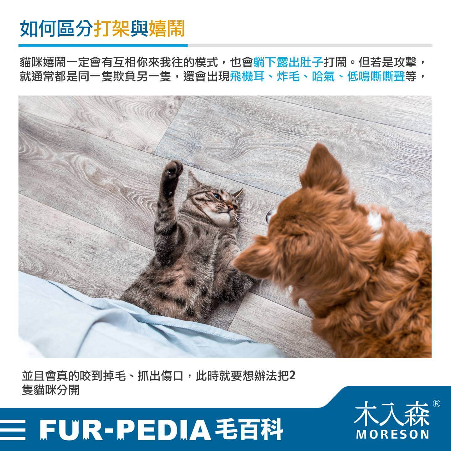 貓咪嬉鬧一定會有互相你來我往的模式,也會躺下露出肚子打鬧。但若是攻擊,就通常都是同一隻欺負另一隻,還會出現飛機耳、炸毛、哈氣、低鳴嘶嘶聲等,並且會真的咬到掉毛、抓出傷口,此時就要想辦法把2隻貓咪分開。