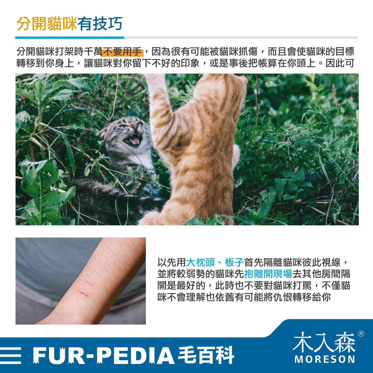 分開貓咪打架時千萬不要用手,因為很有可能被貓咪抓傷,而且會使貓咪的目標轉移到你身上,讓貓咪對你留下不好的印象,或是事後把帳算在你頭上。