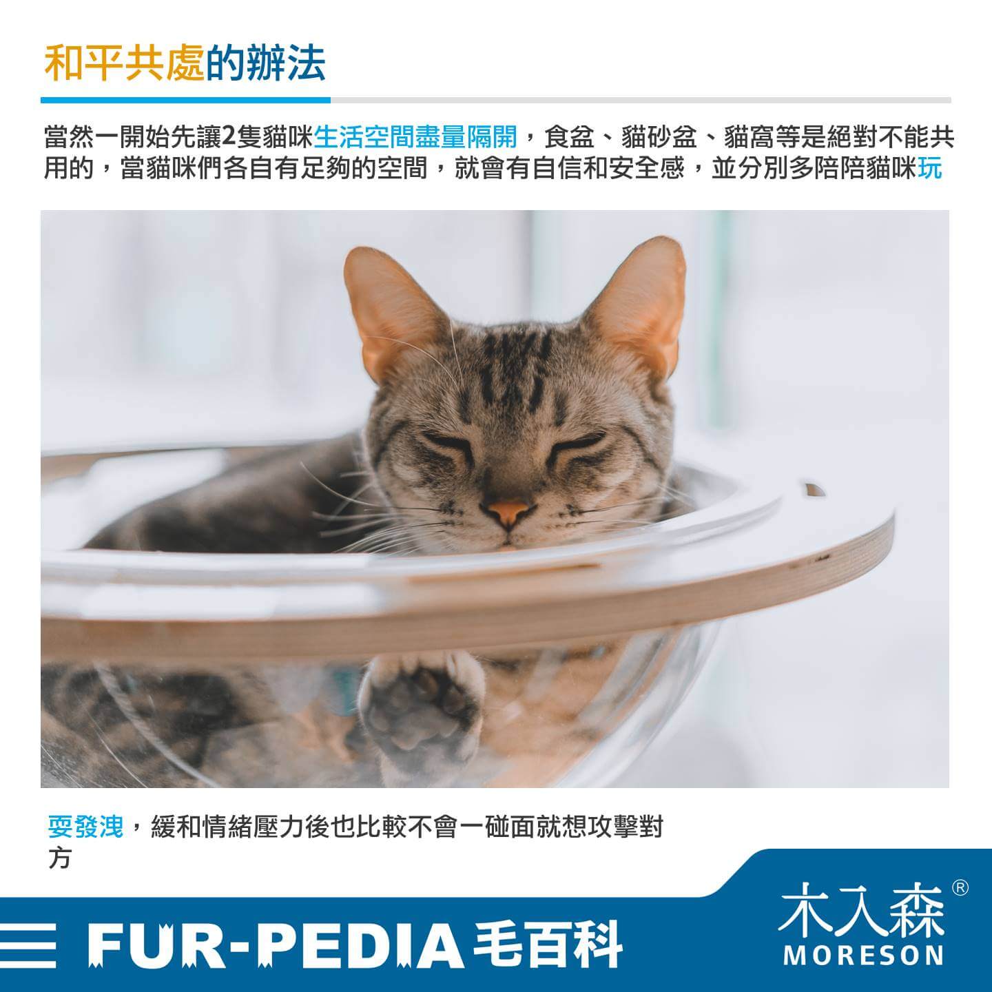當然一開始先讓2隻貓咪生活空間盡量隔開,食盆、貓砂盆、貓窩等是絕對不能共用的,當貓咪們各自有足夠的空間,就會有自信和安全感,並分別多陪陪貓咪玩耍發洩,緩和情緒壓力後也比較不會一碰面就想攻擊對方。