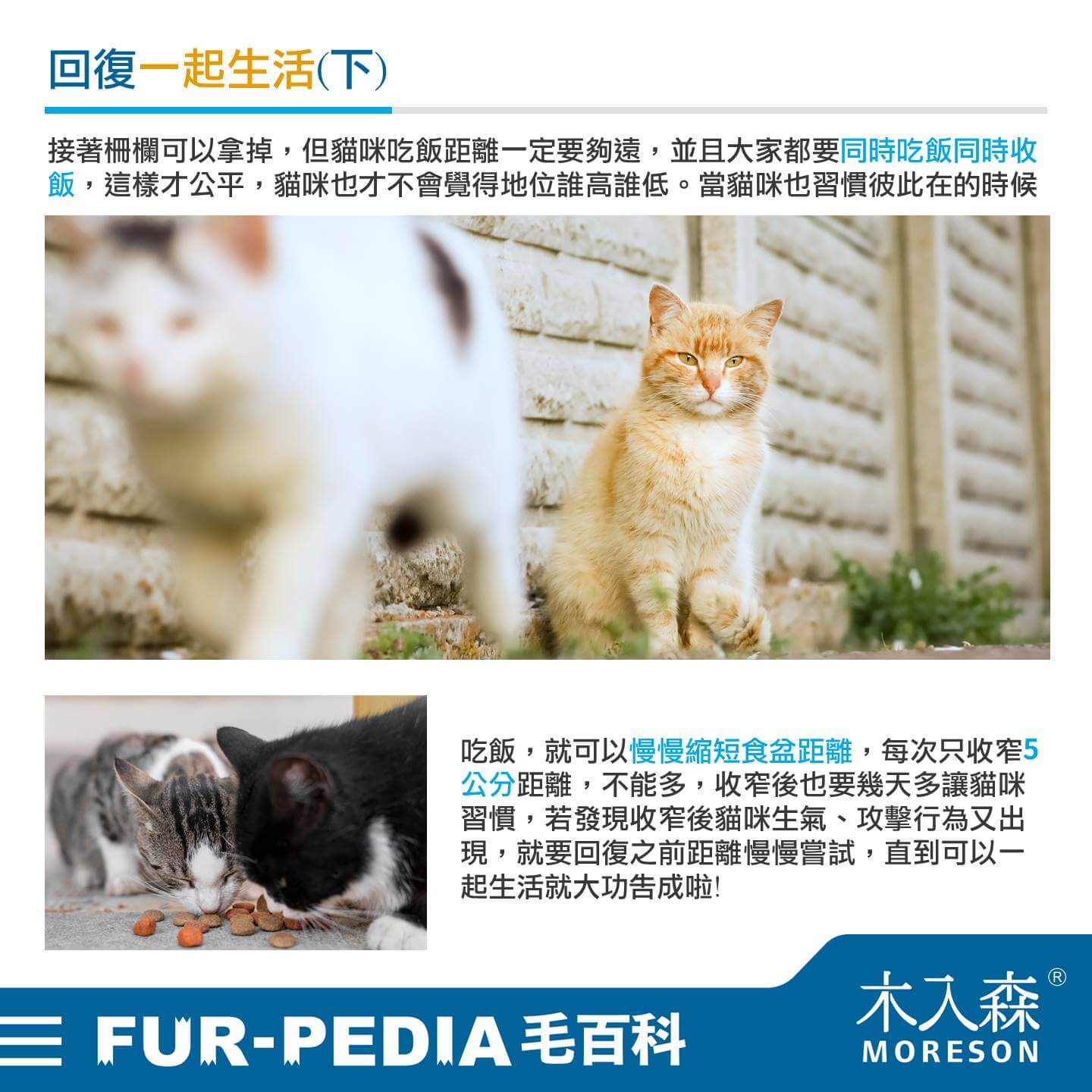 接著柵欄可以拿掉,但貓咪吃飯距離一定要夠遠,並且大家都要同時吃飯同時收飯,這樣才公平,貓咪也才不會覺得地位誰高誰低。當貓咪也習慣彼此在的時候吃飯,就可以慢慢縮短食盆距離,每次只收窄5 cm距離,不能多,收窄後也要幾天多讓貓咪習慣,若發現收窄後貓咪生氣、攻擊行為又出現,就要回復之前距離慢慢嘗試,直到可以一起生活就大功告成啦!