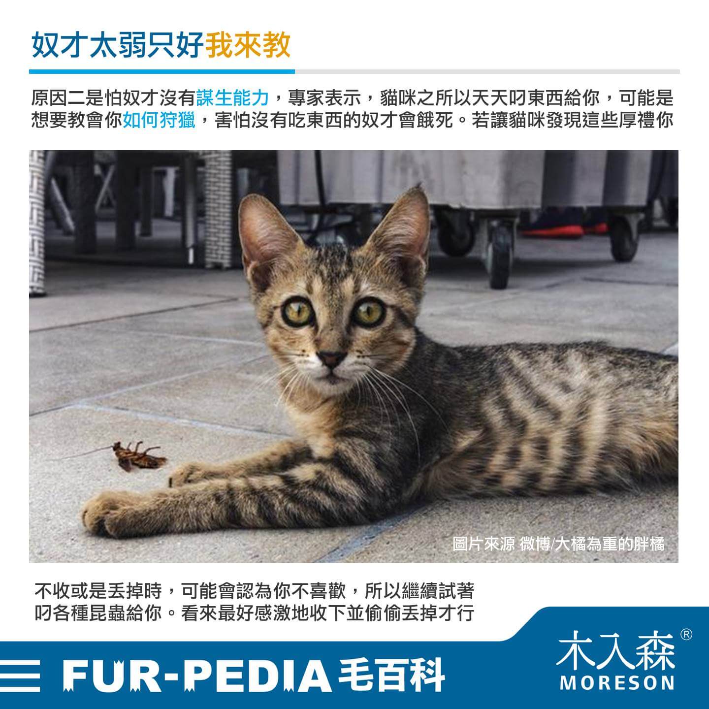 原因二是怕奴才沒有謀生能力,專家表示,貓咪之所以天天叼東西給你,可能是想要教會你如何狩獵,害怕沒有吃東西的奴才會餓死。若讓貓咪發現這些厚禮你不收或是丟掉時,可能會認為是奴才不喜歡,所以繼續試著叼各種昆蟲給你。看來最好感激地收下並偷偷丟掉才行~