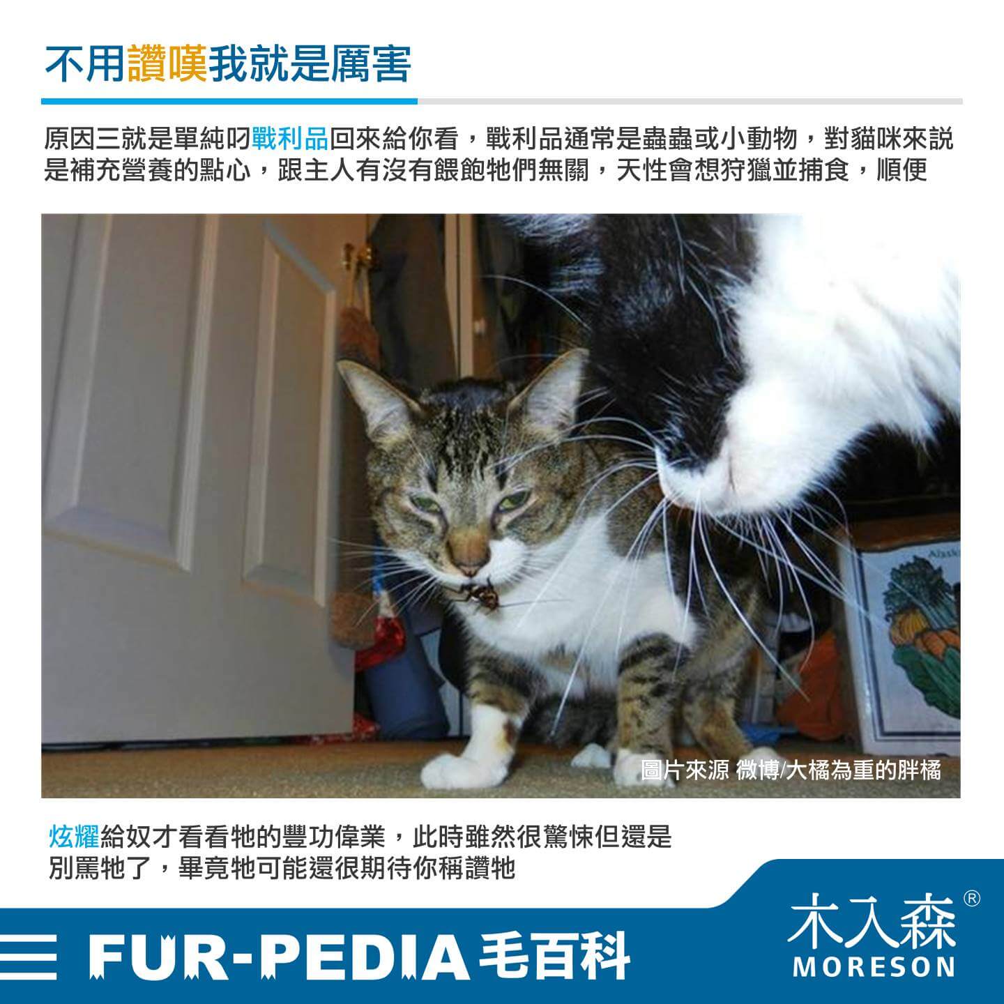 原因三就是單純叼戰利品回來給你看,戰利品通常是蟲蟲或小動物,對貓咪來說是補充營養的點心,跟主人有沒有餵飽牠們無關,天性會想狩獵並捕食,順便炫耀給奴才看看牠的豐功偉業,此時雖然很驚悚但還是別罵牠了,畢竟牠可能還很期待你稱讚牠。