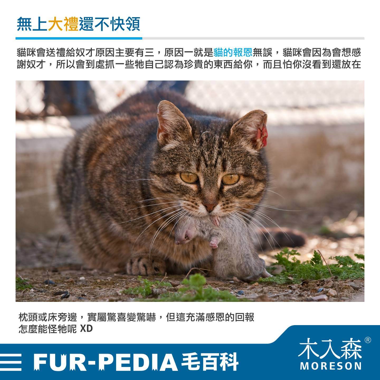 貓咪會送禮給奴才原因主要有三,原因一就是貓的報恩無誤,貓咪會因為會想感謝奴才,所以會到處抓一些牠自己認為珍貴的東西給你,而且怕你沒看到還放在枕頭或床旁邊,實屬驚喜變驚嚇,但這充滿感恩的回報怎麼能怪牠呢XD