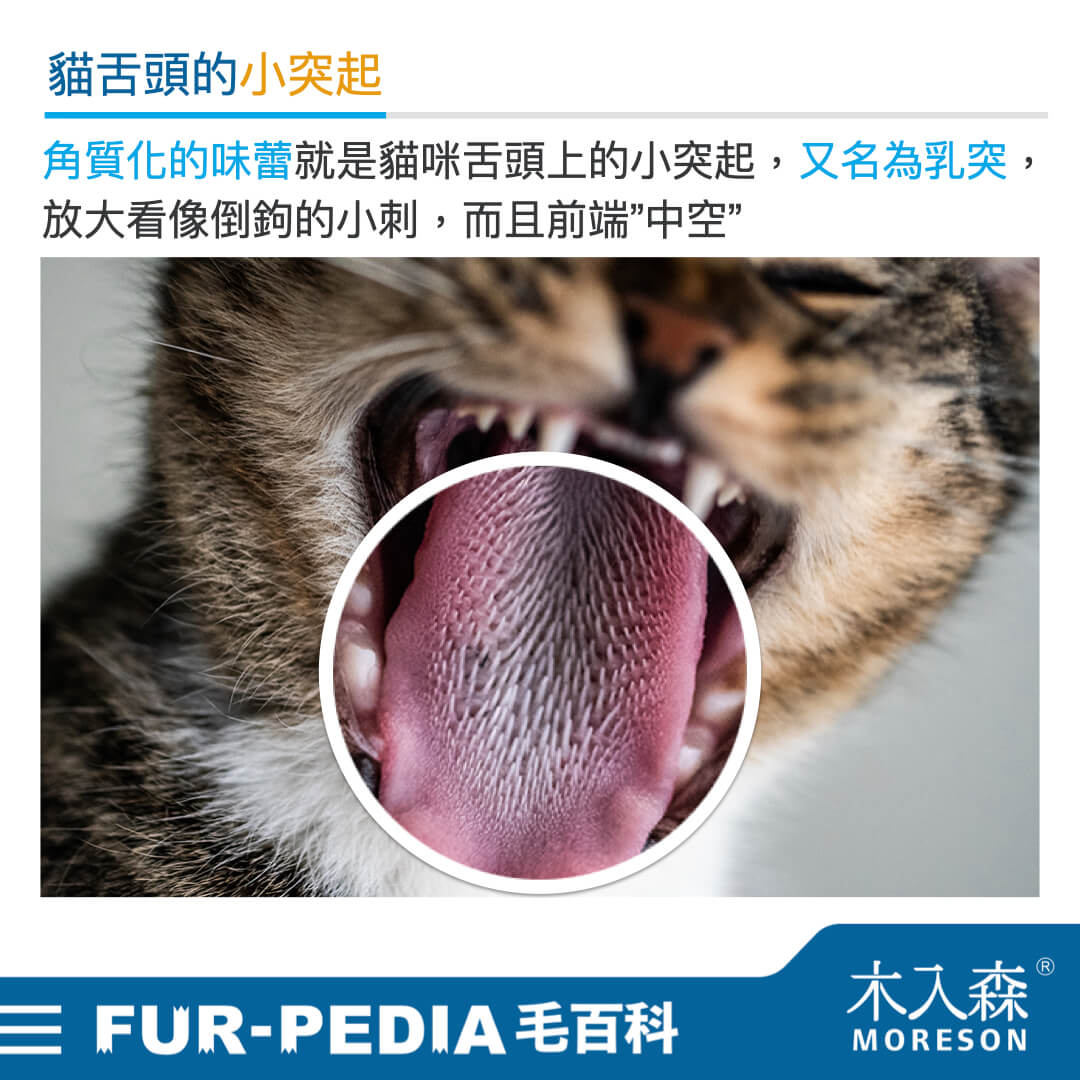 貓咪舌頭上有超過200-300的味蕾,而角質化的味蕾就是貓咪舌頭上的小突起,又名為乳突,乳突放大會看起來像倒鉤的小刺,而且前端是”中空”的,密密麻麻的微小倒鉤刺,讓貓舌頭有砂紙般的質感。
