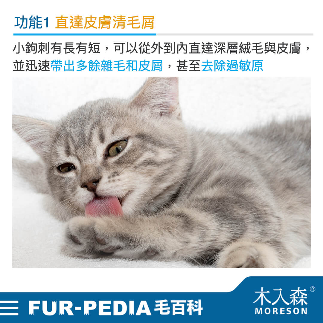 不要小看這些小鉤刺,它們有長有短,不只能清潔較長、較稀疏的外層毛髮,也能清理緊貼皮膚、如羽絨一般的濃密內層絨毛,並迅速理出皮膚上多餘的雜毛和皮屑,甚至幫助除掉貓毛中的過敏原,因為小鉤刺柔軟又具有彈性,相對於一般梳子可以更省力、更舒服地理毛。