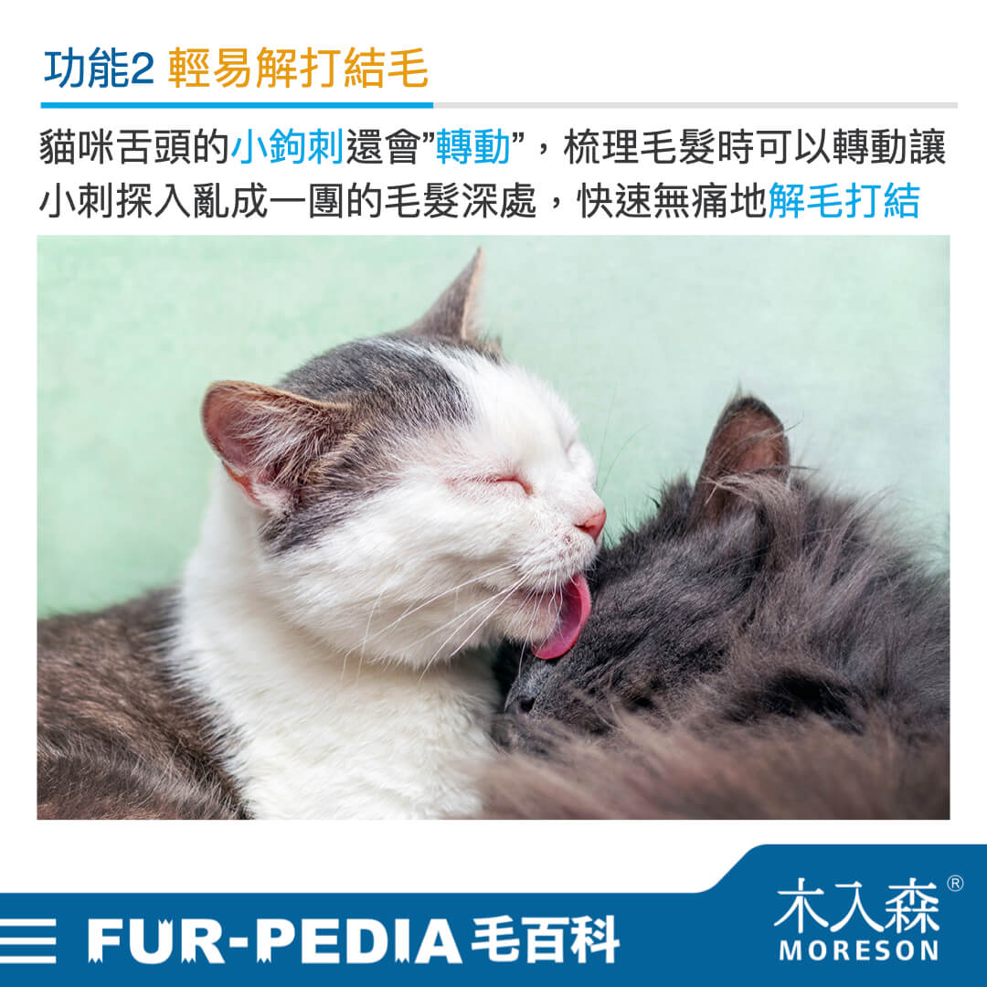 貓咪舌頭的小鉤刺除了具有彈性,還會”轉動”,當貓舌頭碰到毛皮打結處時,小鉤刺就會轉動,轉動時可以讓小刺探入亂成一團的毛髮深處,最後流暢又無痛地化解惱人的毛髮糾結,完全不是一般梳子可以比擬的。