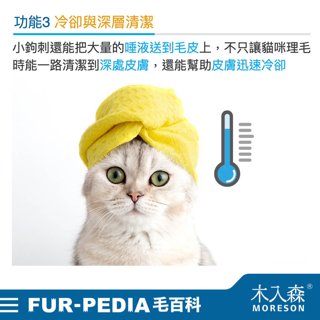 小鉤刺還能通過”中空”的末端從口腔中帶出豐富唾液送到貓咪毛皮上,當貓咪每次舔毛,就會將近一半的唾液留在毛皮上,平均可以留下48毫升的水分傳遞到毛髮及深處皮膚,可以迅速有效深度清潔毛皮,並留下唾液在皮膚上,當唾液蒸發的時候,還能顯著幫貓咪降低體溫。