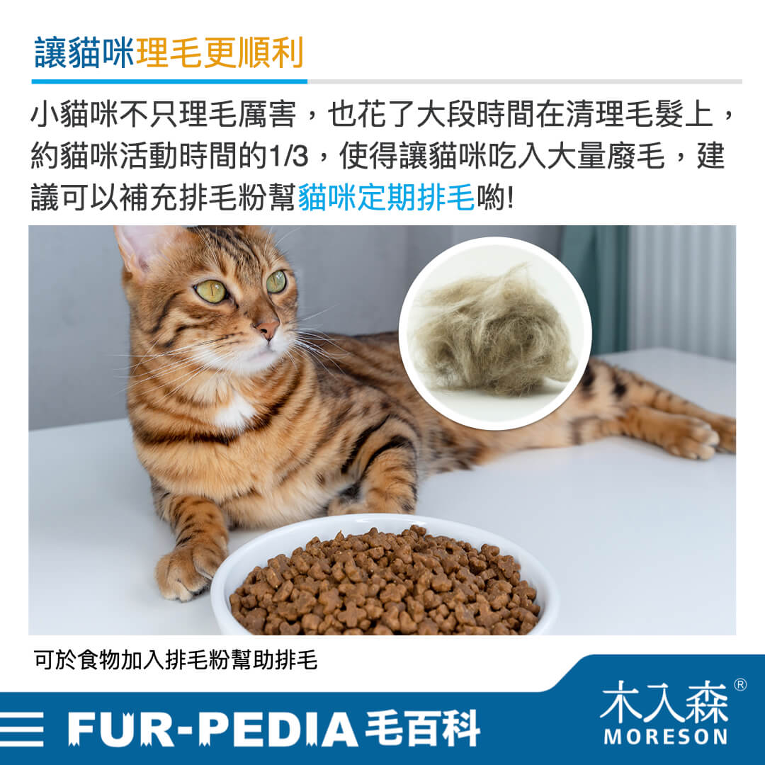 貓咪不只理毛厲害,也花了大段時間在清理毛髮上,貓咪活動時約有1/3的時間在舔毛,與花在睡覺的時間差不多,但這麼多時間與高效清潔毛髮能力,會讓貓咪吃入大量廢毛,若不想貓咪總是在吐毛,也不像野外貓咪有野草可幫助消化,一定要多幫貓咪補充排毛粉等產品定期排毛呦~