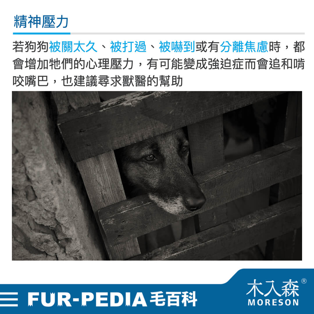 會造成狗狗精神壓力增大的原因有很多,例如被關太久、被打過、被嚇到、有分離焦慮等,都可能會使狗狗壓力過大導致強迫症,而有強迫症的狗狗最常見的就是追尾巴,且嚴重時會啃咬尾巴產生傷口,因此也建議盡早找獸醫幫忙,並諮詢醫師緩和狗狗壓力與情緒的方法喔!