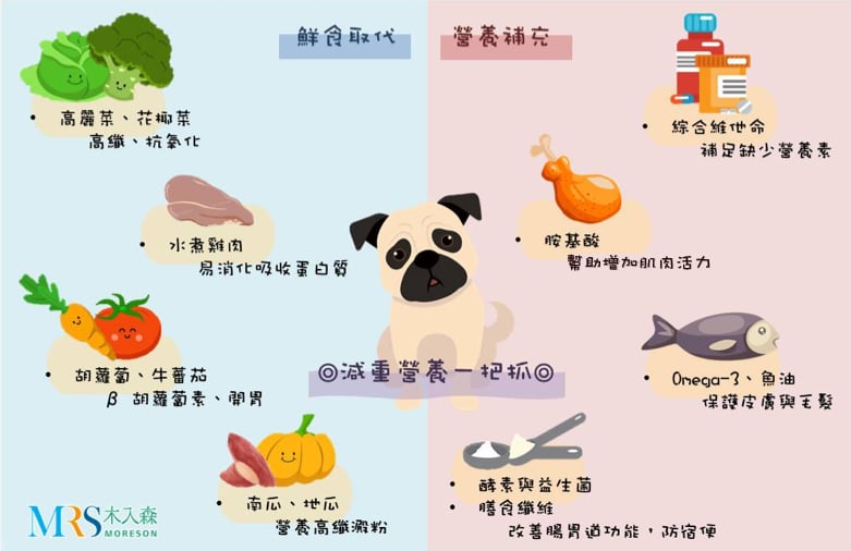 在幫狗狗做減重飲食期間,尤其是年紀稍長的老狗,必須注意狗狗「營養的完整與豐富」。