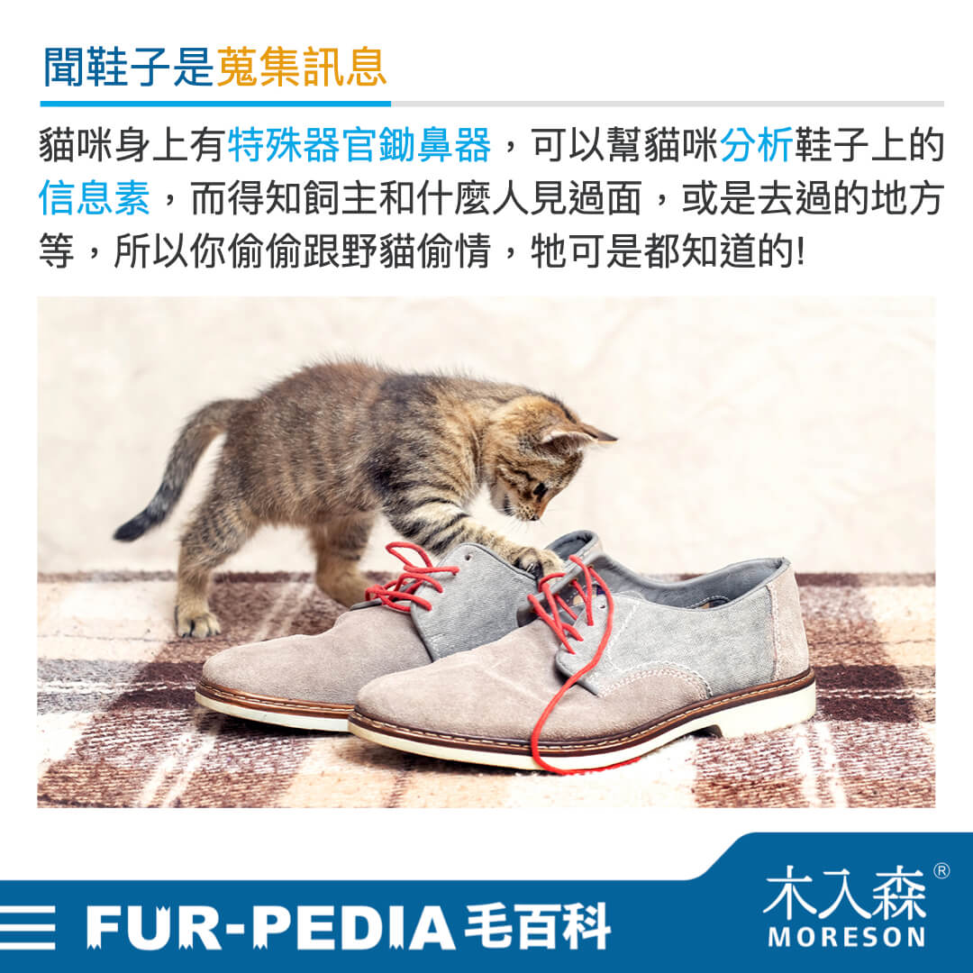 別以為貓咪聞鞋子只是因為喜愛主人或愛鞋子怪味的蠢萌行為,牠其實正在蒐集你從外面帶回來的大量訊息喔!貓咪是嗅覺極佳的動物,嗅覺強度為人類的14倍,這都要歸功於貓咪身上的特殊嗅覺器官「鋤鼻器」,它可以幫貓咪分析鞋子上的氣味和信息素,進一步得知飼主身上的味道類型、和什麼人(貓)見過面,或是去過的地方等等,所以你偷偷在外面跟野貓”偷情”,牠可是都知道的!