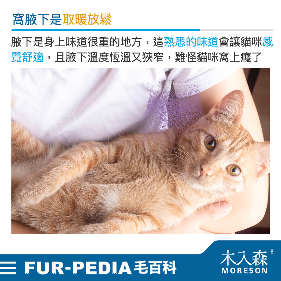 腋下和臭腳丫子都是主人身上味道最重的地方,這種來自主人熟悉又濃厚的味道會讓貓咪感覺舒適,並有效緩解焦慮和緊張的情緒,而且腋下味道與羊毛脂頗為相似,這種味道也會對部分貓咪具有吸引力。不僅如此,腋下溫度多維持在人核心體溫36-37度,這樣被環抱且溫暖的環境也會讓貓咪愛不釋手喲!