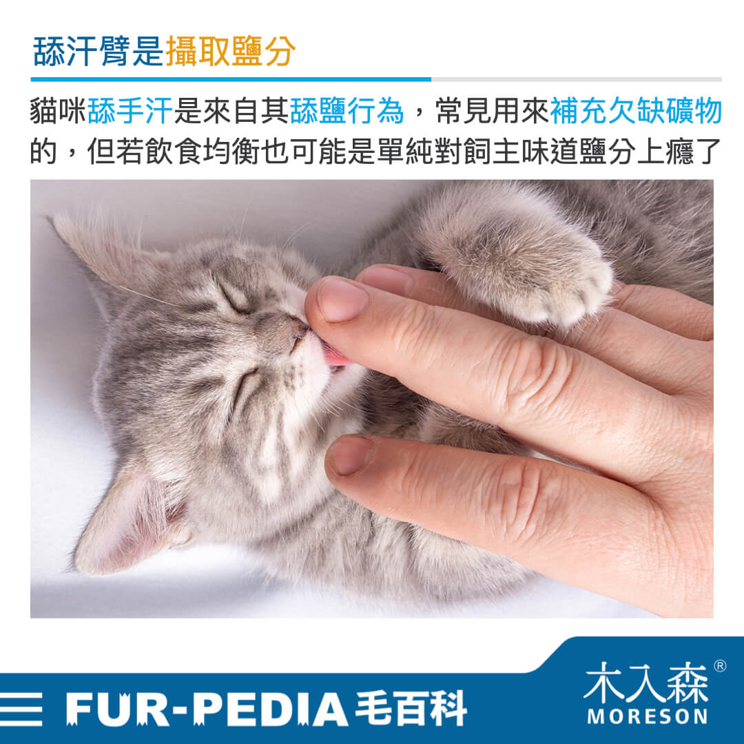 貓咪來舔流了汗的手腳很可能是因為來自動物本能的「舔鹽行為」,是動物用來補充食物中欠缺礦物的常見行為,若發現你家貓咪很愛舔流汗後的手腳,首先要注意貓咪飲食中的鹽分有無缺乏,若都飲食均衡牠還很愛舔,也有可能對這充滿主人味道的鹽分上癮了,這也許是一種另類的愛~
