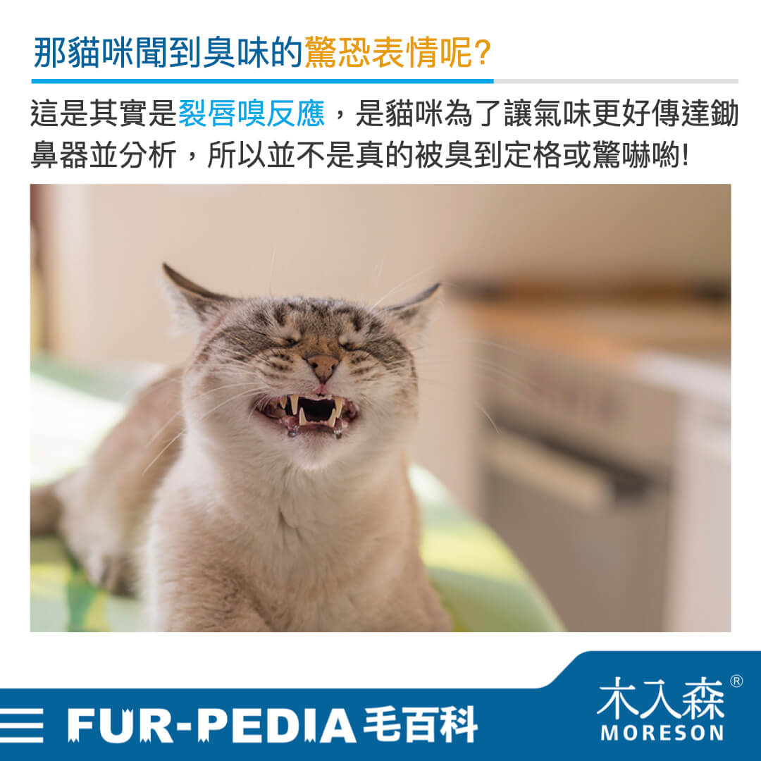 其實貓咪有時聞腋下、腳丫子或鞋子後會出現這種反應,是一種叫做「裂唇嗅反應」的行為,將上唇翻起、張口露出上門牙,都是為了讓氣味更好傳達到鋤鼻器,來分析、探查氣味訊息,並不是真的被臭到定格或驚嚇喲!