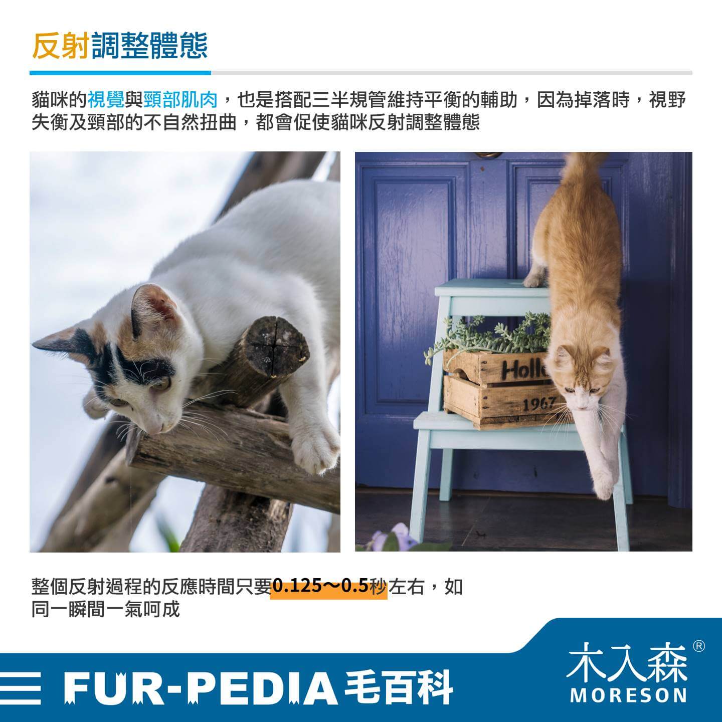 貓咪的視覺與頸部肌肉,也是搭配三半規管維持平衡的輔助,因為掉落時,視野失衡及頸部的不自然扭曲,都會促使貓咪反射調整體態,整個反射過程的反應時間只要0.125~0.5秒左右,如同一瞬間一氣呵成。