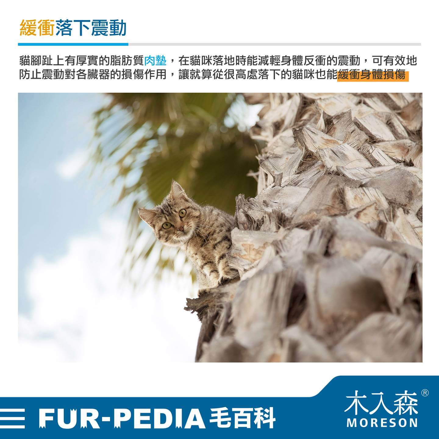 貓腳趾上有厚實的脂肪質肉墊,在貓咪落地時能減輕身體反衝的震動,可有效地防止震動對各臟器的損傷作用,讓就算從很高處落下的貓咪也能緩衝身體損傷。