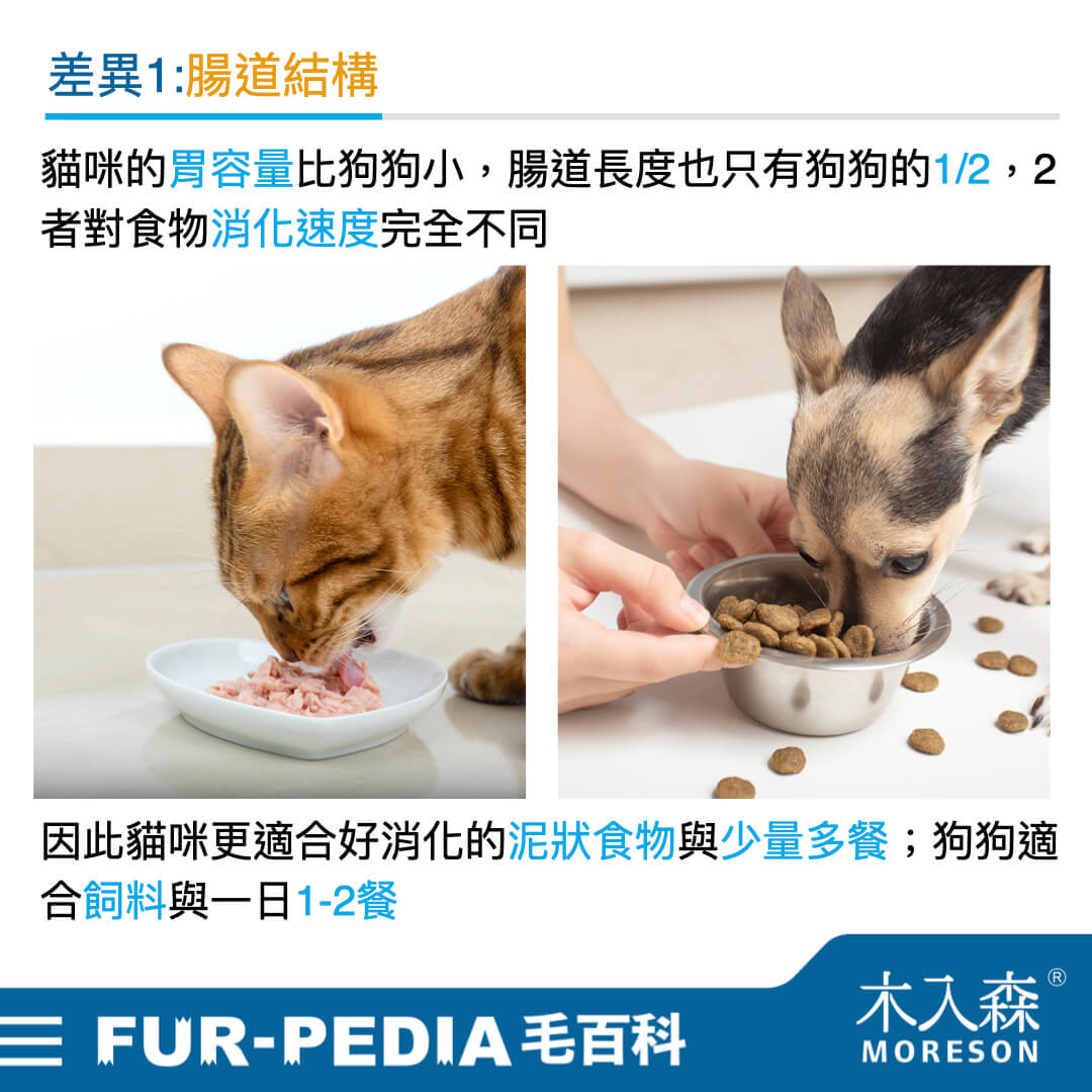 腸道結構大小會影響食物停留在犬貓體內時間,而貓咪的胃容量比狗狗小,腸道長度也只有狗狗的1/2,因此貓咪跟狗狗對食物的消化速度是完全不同的,貓咪食物排空快,更適合好消化吸收的泥狀食物與少量多餐;而狗狗食物排空速度慢,消化時間是貓咪的3倍,因為可以消化久一點,所以給飼料和一天1-2餐都是適合的。